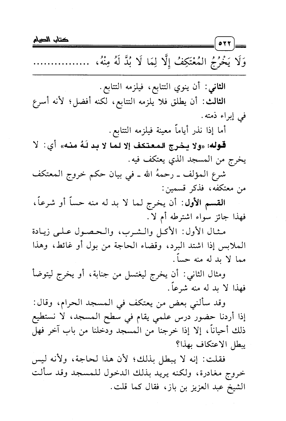 شرع المؤلف ـ رحمه الله ـ في بيان حكم خروج المعتكف من معتكفه، فذكر قسمين: