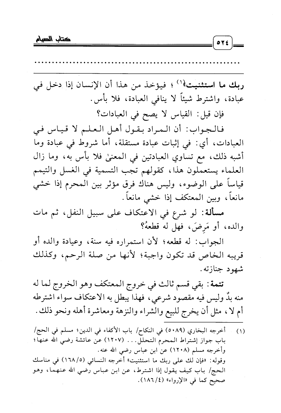 وقوله: «فإن لك على ربك ما استثنيت» أخرجه النسائي (5/ 168) في مناسك الحج/ باب كيف يقول إذا اشترط، عن ابن عباس رضي الله عنهما، وهو صحيح كما في «الإرواء» (4/ 186).