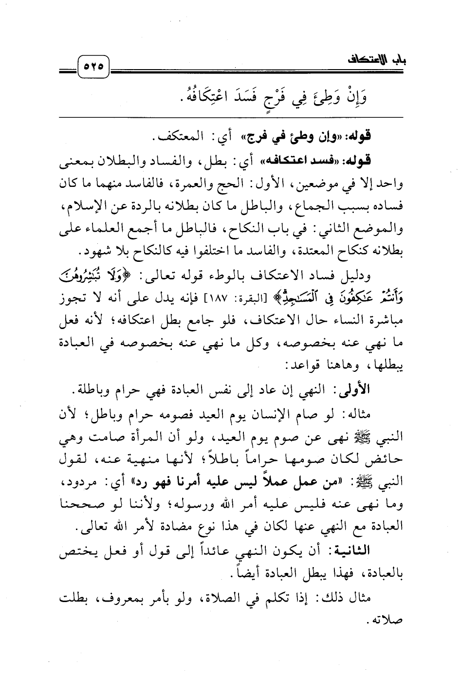 ودليل فساد الاعتكاف بالوطء قوله تعالى: {وَلاَ تُبَاشِرُوهُنَّ وَأَنْتُمْ عَاكِفُونَ فِي الْمَسَاجِدِ} [البقرة: 187] فإنه يدل على أنه لا تجوز مباشرة النساء حال الاعتكاف، فلو جامع بطل اعتكافه؛ لأنه فعل ما نهي عنه بخصوصه، وكل ما نهي عنه بخصوصه في العبادة يبطلها، وهاهنا قواعد: