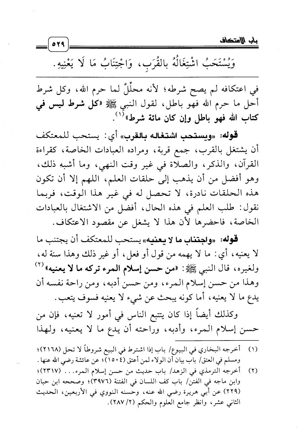 قوله: «واجتناب ما لا يعنيه» يستحب للمعتكف أن يجتنب ما لا يعنيه، أي: ما لا يهمه من قول أو فعل، أو غير ذلك وهذا سنة له، ولغيره، قال النبي صلّى الله عليه وسلّم: «من حسن إسلام المرء تركه ما لا يعنيه» (¬2) وهذا من حسن إسلام المرء، ومن حسن أدبه، ومن راحة نفسه أن يدع ما لا يعنيه، أما كونه يبحث عن شيء لا يعنيه فسوف يتعب.