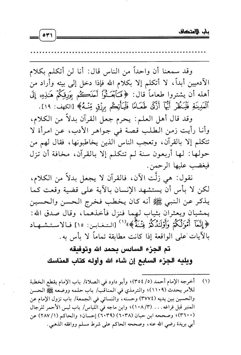 وقد قال أهل العلم: يحرم جعل القرآن بدلاً من الكلام، وأنا رأيت زمن الطلب قصة في جواهر الأدب، عن امرأة لا تتكلم إلا بالقرآن، وتعجب الناس الذين يخاطبونها، فقال لهم من حولها: لها أربعون سنة لم تتكلم إلا بالقرآن، مخافة أن تزل فيغضب عليها الرحمن.