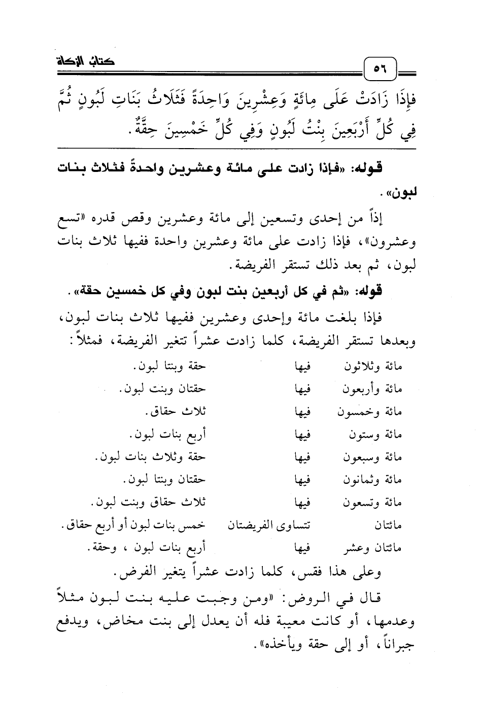 فإِذَا زَادَتْ عَلَى مِائَةٍ وَعِشْرِينَ وَاحِدَةً فَثَلاَثُ بَنَاتِ لَبُونٍ ثُمَّ فِي كُلِّ أَرْبَعِينَ بِنْتُ لَبُونٍ وَفِي كُلِّ خَمْسِينَ حِقَّةٌ ........