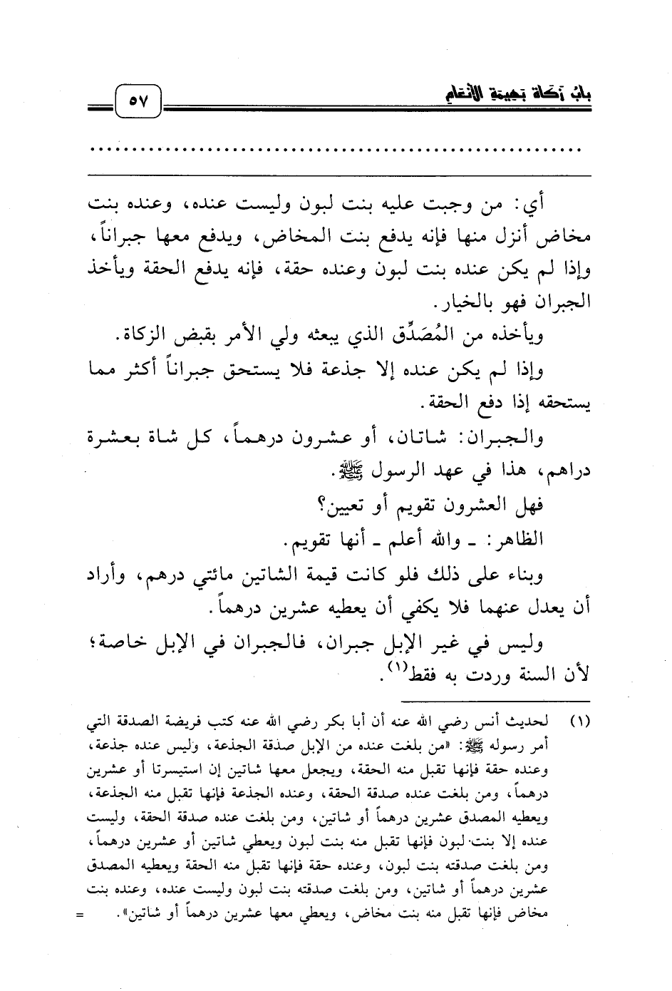 (¬1) لحديث أنس رضي الله عنه أن أبا بكر رضي الله عنه كتب فريضة الصدقة التي أمر رسوله صلّى الله عليه وسلّم: «من بلغت عنده من الإبل صدقة الجذعة، وليس عنده جذعة، وعنده حقة فإنها تقبل منه الحقة، ويجعل معها شاتين إن استيسرتا أو عشرين درهماً، ومن بلغت عنده صدقة الحقة، وعنده الجذعة فإنها تقبل منه الجذعة، ويعطيه المصدق عشرين درهماً أو شاتين، ومن بلغت عنده صدقة الحقة، وليست عنده إلا بنت لبون فإنها تقبل منه بنت لبون ويعطي شاتين أو عشرين درهماً، ومن بلغت صدقته بنت لبون، وعنده حقة فإنها تقبل منه الحقة ويعطيه المصدق عشرين درهماً أو شاتين، ومن بلغت صدقته بنت لبون وليست عنده، وعنده بنت مخاض فإنها تقبل منه بنت مخاض، ويعطي معها عشرين درهماً أو شاتين».