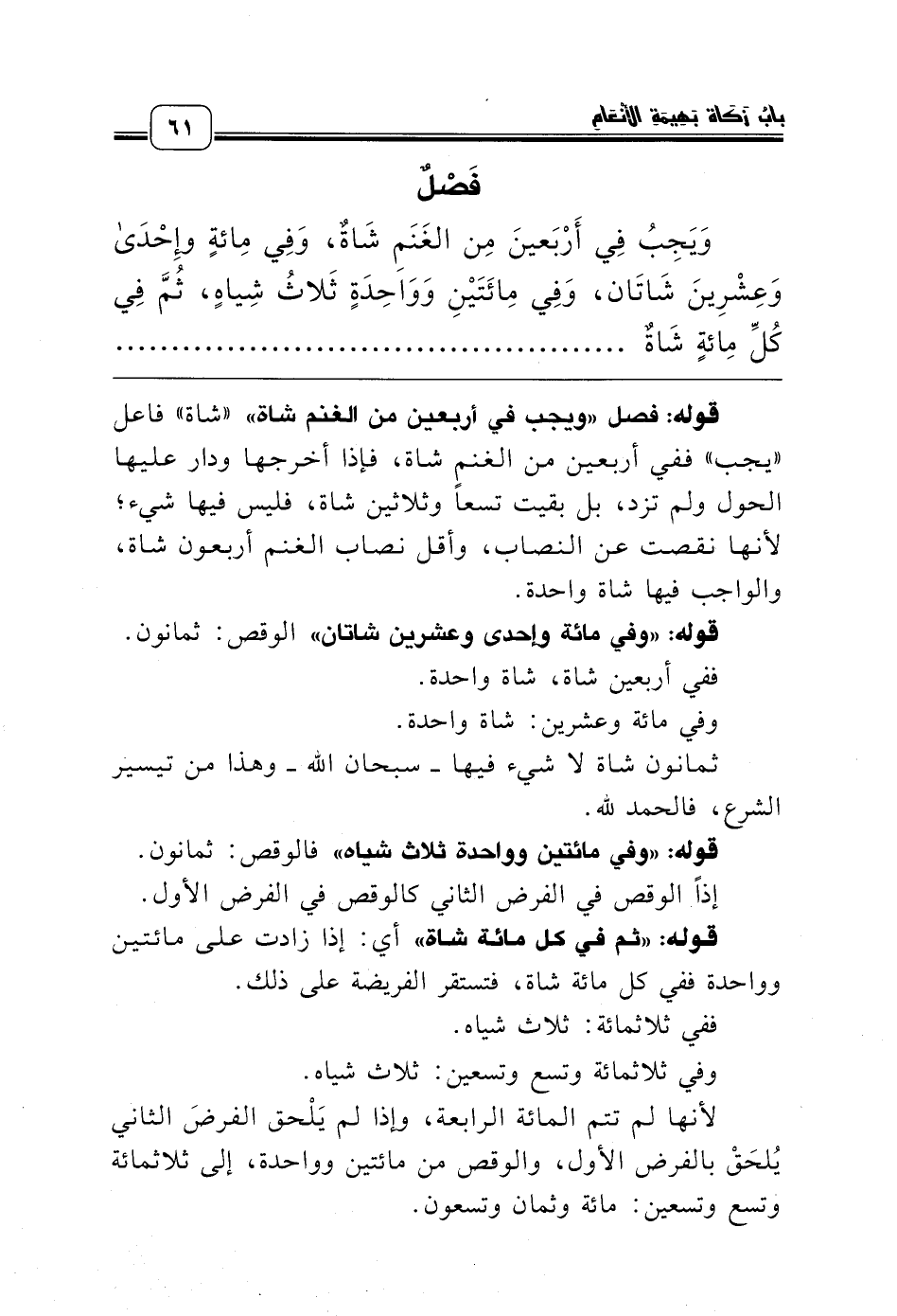 قوله: فصل «ويجب في أربعين من الغنم شاة» «شاة» فاعل «يجب» ففي أربعين من الغنم شاة، فإذا أخرجها ودار عليها الحول ولم تزد، بل بقيت تسعاً وثلاثين شاة، فليس فيها شيء؛ لأنها نقصت عن النصاب، وأقل نصاب الغنم أربعون شاة، والواجب فيها شاة واحدة.