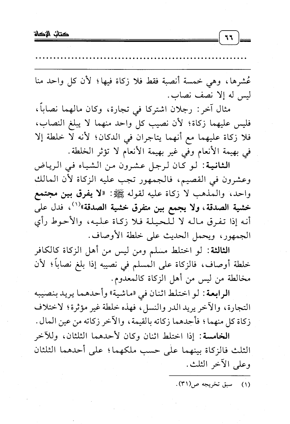 الخامسة: إذا اختلط اثنان وكان لأحدهما الثلثان، وللآخر الثلث فالزكاة بينهما على حسب ملكهما؛ على أحدهما الثلثان وعلى الآخر الثلث.
