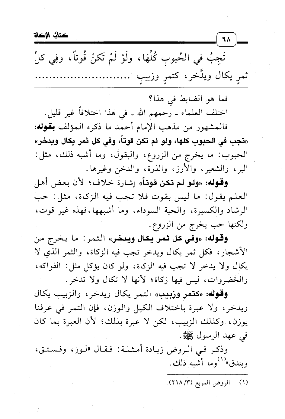 فالمشهور من مذهب الإمام أحمد ما ذكره المؤلف بقوله: «تجب في الحبوب كلها، ولو لم تكن قوتاً، وفي كل ثمر يكال ويدخر» الحبوب: ما يخرج من الزروع، والبقول، وما أشبه ذلك، مثل: البر، والشعير، والأرز، والذرة، والدخن وغيرها.