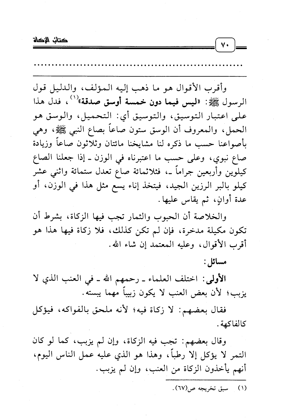 وأقرب الأقوال هو ما ذهب إليه المؤلف، والدليل قول الرسول صلّى الله عليه وسلّم: «ليس فيما دون خمسة أوسق صدقة» (¬1)، فدل هذا على اعتبار التوسيق، والتوسيق أي: التحميل، والوسق هو الحمل، والمعروف أن الوسق ستون صاعاً بصاع النبي صلّى الله عليه وسلّم، وهي بأصواعنا حسب ما ذكره لنا مشايخنا مائتان وثلاثون صاعاً وزيادة صاع نبوي، وعلى حسب ما اعتبرناه في الوزن ـ إذا جعلنا الصاع كيلوين وأربعين جراماً ـ، فثلاثمائة صاع تعدل ستمائة واثني عشر كيلو بالبر الرزين الجيد، فيتخذ إناء يسع مثل هذا في الوزن، أو عدة أوانٍ، ثم يقاس عليها.