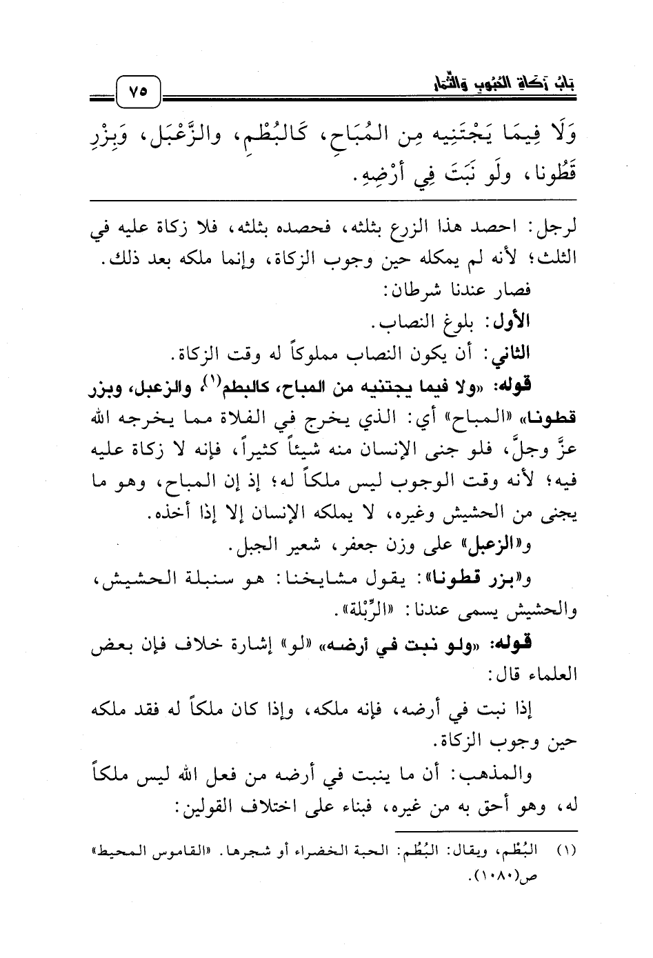 قوله: «ولا فيما يجتنيه من المباح، كالبطم (¬1)، والزعبل، وبزر قطونا» «المباح» أي: الذي يخرج في الفلاة مما يخرجه الله عزّ وجل، فلو جنى الإنسان منه شيئاً كثيراً، فإنه لا زكاة عليه فيه؛ لأنه وقت الوجوب ليس ملكاً له؛ إذ إن المباح، وهو ما يجنى من الحشيش وغيره، لا يملكه الإنسان إلا إذا أخذه.