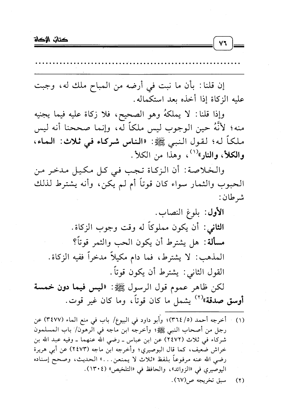 (¬1) أخرجه أحمد (5/ 364)؛ وأبو داود في البيوع/ باب في منع الماء (3477) عن رجل من أصحاب النبي صلّى الله عليه وسلّم؛ وأخرجه ابن ماجه في الرهون/ باب المسلمون شركاء في ثلاث (2472) عن ابن عباس ـ رضي الله عنهما ـ وفيه عبد الله بن خراش ضعيف، كما قال البوصيري؛ وأخرجه ابن ماجه (2473) عن أبي هريرة رضي الله عنه مرفوعاً بلفظ «ثلاث لا يمنعن ... » الحديث، وصحح إسناده البوصيري في «الزوائد»، والحافظ في «التلخيص» (1304).