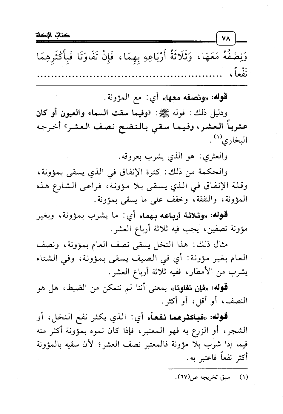 قوله: «وثلاثة أرباعه بهما» أي: ما يشرب بمؤونة، وبغير مؤونة نصفين، يجب فيه ثلاثة أرباع العشر.
