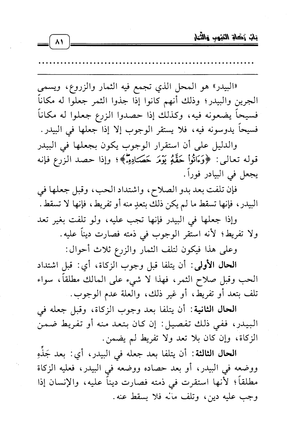 وعلى هذا فيكون لتلف الثمار والزرع ثلاث أحوال: