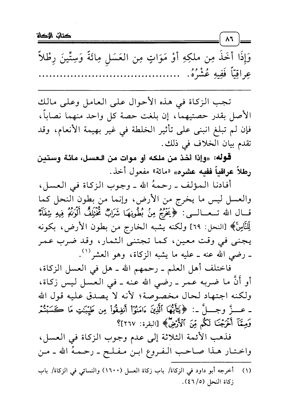 وَإِذَا أخَذَ مِن ملكِهِ أوْ مَوَاتٍ مِن العَسَلِ مِائَةً وَسِتِّينَ رِطْلاً عِراقِيّاً فَفِيهِ عُشْرُهُ .......