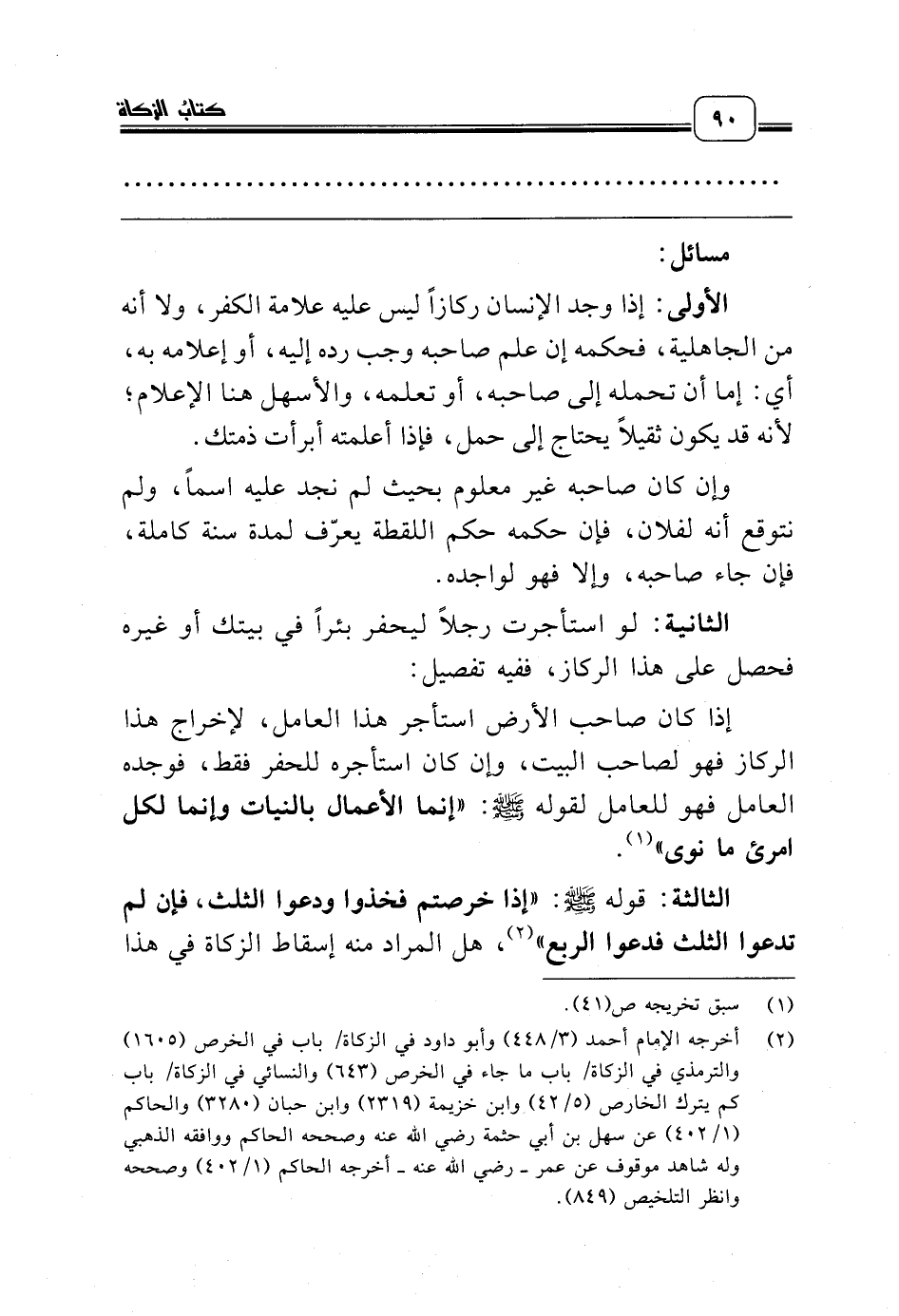 الأولى: إذا وجد الإنسان ركازاً ليس عليه علامة الكفر، ولا أنه من الجاهلية، فحكمه إن علم صاحبه وجب رده إليه، أو إعلامه به، أي: إما أن تحمله إلى صاحبه، أو تعلمه، والأسهل هنا الإعلام؛ لأنه قد يكون ثقيلاً يحتاج إلى حمل، فإذا أعلمته أبرأت ذمتك.