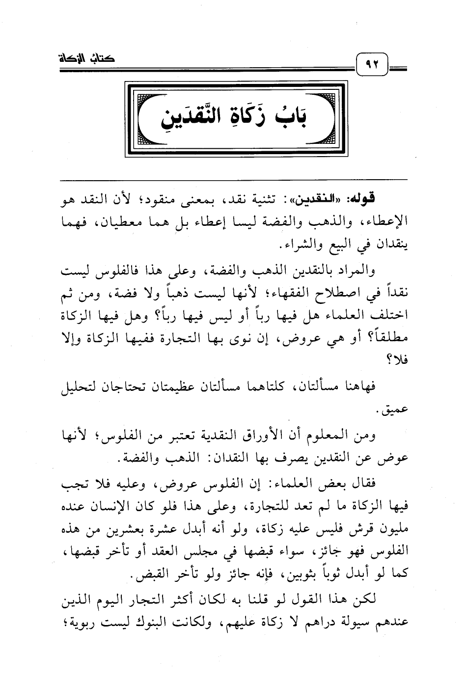 والمراد بالنقدين الذهب والفضة، وعلى هذا فالفلوس ليست نقداً في اصطلاح الفقهاء؛ لأنها ليست ذهباً ولا فضة، ومن ثم اختلف العلماء هل فيها رباً أو ليس فيها رباً؟ وهل فيها الزكاة مطلقاً؟ أو هي عروض، إن نوى بها التجارة ففيها الزكاة وإلا فلا؟