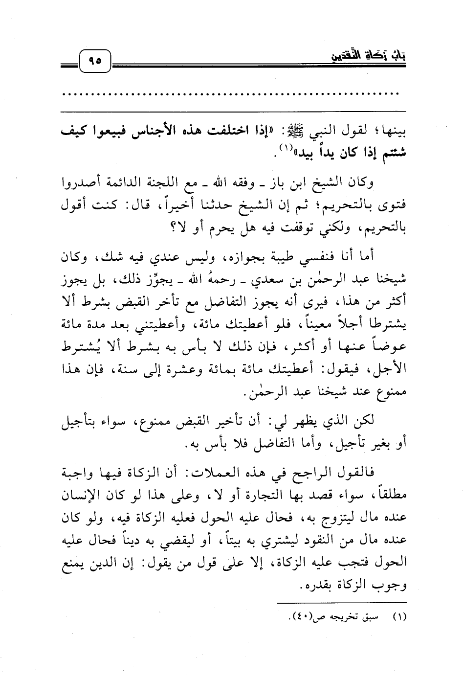 أما أنا فنفسي طيبة بجوازه، وليس عندي فيه شك، وكان شيخنا عبد الرحمن بن سعدي ـ رحمه الله ـ يجوِّز ذلك، بل يجوز أكثر من هذا، فيرى أنه يجوز التفاضل مع تأخر القبض بشرط ألا يشترطا أجلاً معيناً، فلو أعطيتك مائة، وأعطيتني بعد مدة مائة عوضاً عنها أو أكثر، فإن ذلك لا بأس به بشرط ألا يُشترط الأجل، فيقول: أعطيتك مائة بمائة وعشرة إلى سنة، فإن هذا ممنوع عند شيخنا عبد الرحمن.