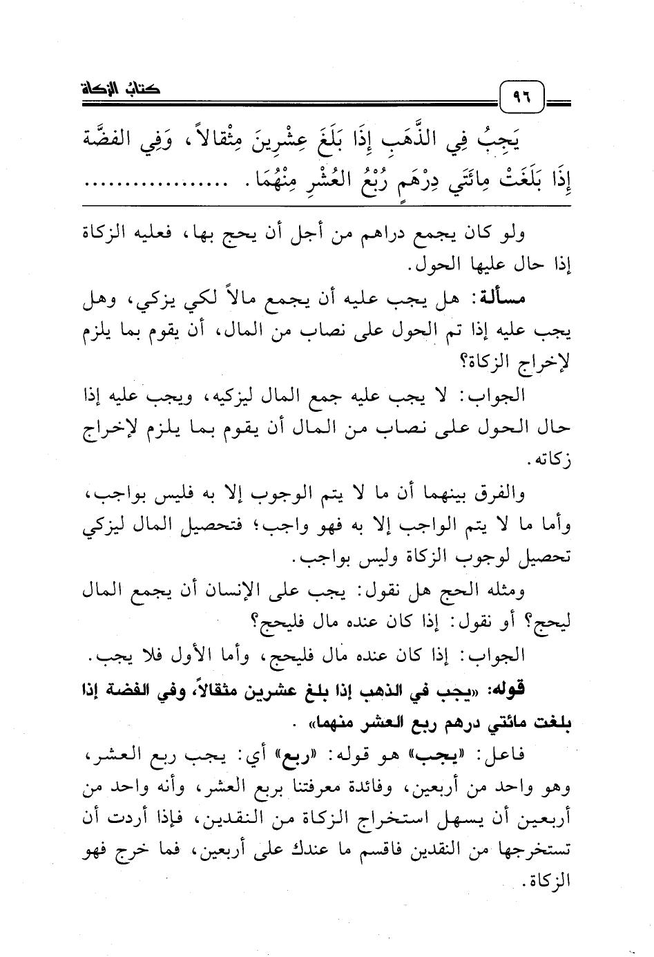 يَجِبُ فِي الذَّهَبِ إِذَا بَلَغَ عِشْرِينَ مِثْقالاً، وَفِي الفضَّة إِذَا بَلَغَتْ مِائَتَي دِرْهَمٍ رُبْعُ العُشْرِ مِنْهُمَا .........
