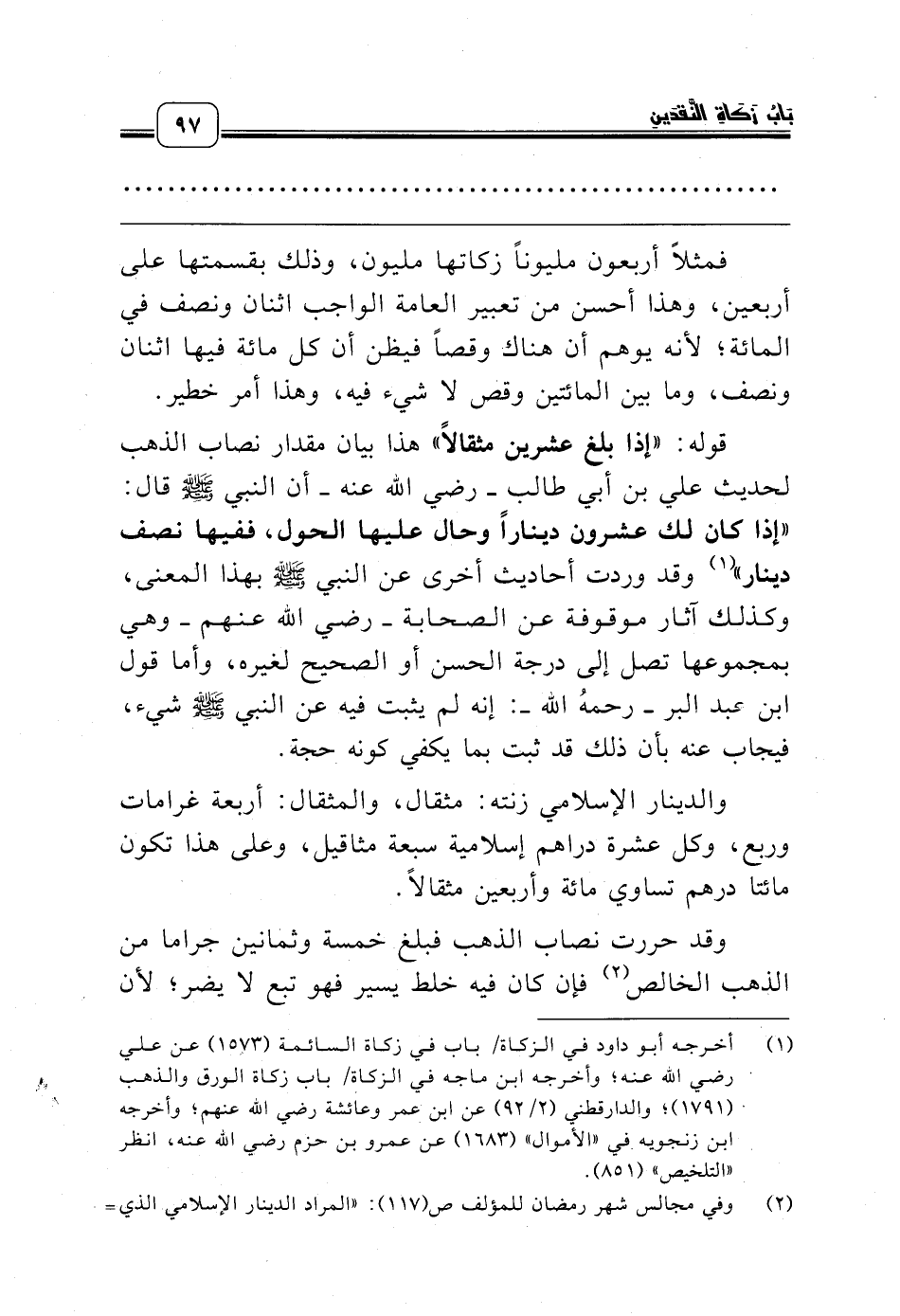 (¬2) وفي مجالس شهر رمضان للمؤلف ص (117): «المراد الدينار الإسلامي الذي يبلغ وزنه مثقالاً: أربعة غرامات وربع، فيكون نصاب الذهب: خمسة وثمانين غراماً، يعادل عشرة جنيهات سعودية وخمسة أثمان الجنيه».