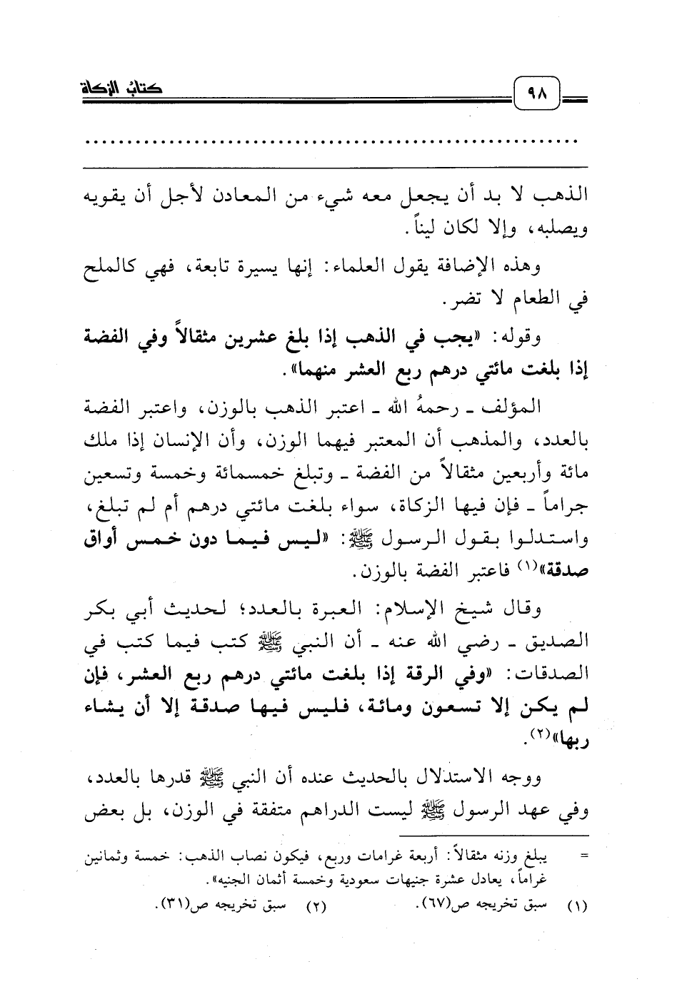 المؤلف ـ رحمه الله ـ اعتبر الذهب بالوزن، واعتبر الفضة بالعدد، والمذهب أن المعتبر فيهما الوزن، وأن الإنسان إذا ملك مائة وأربعين مثقالاً من الفضة ـ وتبلغ خمسمائة وخمسة وتسعين جراماً ـ فإن فيها الزكاة، سواء بلغت مائتي درهم أم لم تبلغ، واستدلوا بقول الرسول صلّى الله عليه وسلّم: «ليس فيما دون خمس أواق صدقة» (¬1) فاعتبر الفضة بالوزن.