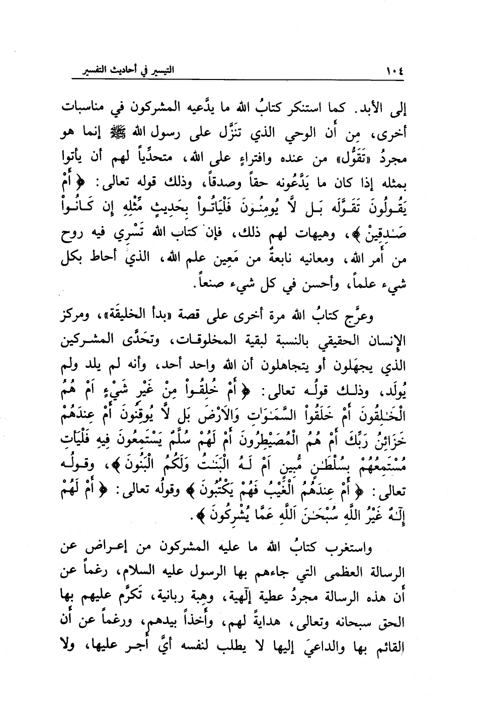 إلى الأبد. كما استنكر كتاب الله ما يدعيه المشركون في مناسبات أخرى، من أن الوحي الذي تنزل على رسول الله صلى الله عليه وسلم إنما هو مجرد " تقوّل " من عنده وافتراء على الله، متحديا لهم أن يأتوا بمثله إذا كان ما يدعونه حقا وصدقا، وذلك قوله تعالى: {أَمْ يَقُولُونَ تَقَوَّلَهُ بَلْ لَا يُؤْمِنُونَ * فَلْيَأْتُوا بِحَدِيثٍ مِثْلِهِ إِنْ كَانُوا صَادِقِينَ}، وهيهات لهم ذلك، فإن كتاب الله تسري فيه روح من أمر الله، ومعانيه نابعة من معين علم الله، الذي أحاط بكل شيء علما، وأحسن في كل شيء صنعا.