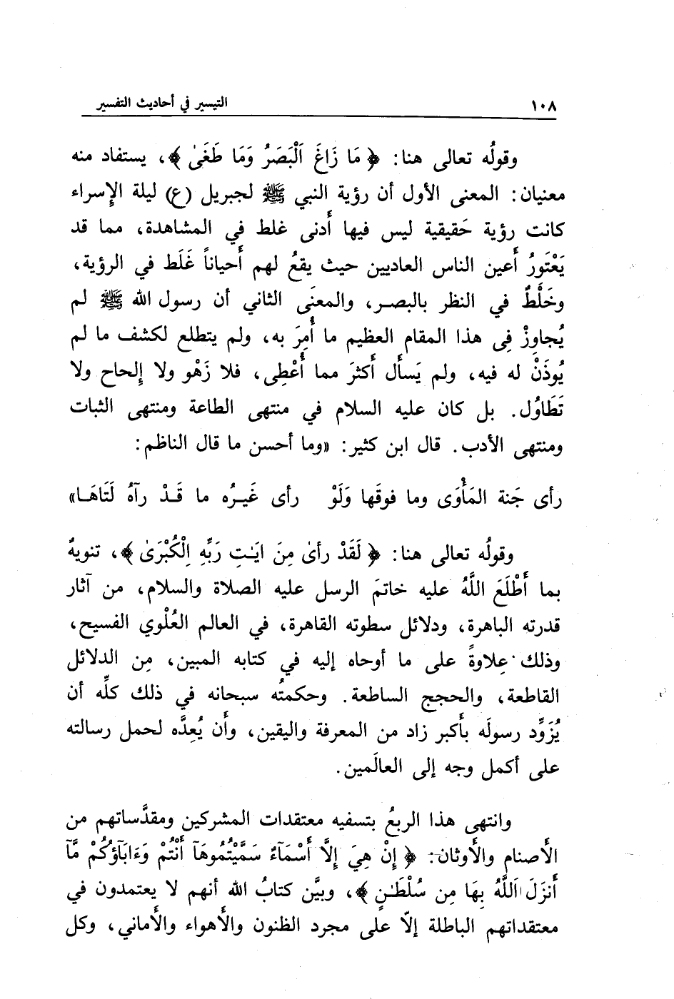 وقوله تعالى هنا: {مَا زَاغَ الْبَصَرُ وَمَا طَغَى}، يستفاد منه معنيان: المعنى الأول أن رؤية النبي صلى الله عليه وسلم لجبريل عليه السلام ليلة الإسراء كانت رؤية حقيقية ليس فيها أدنى غلط في المشاهدة، مما قد يعتوِر أعين الناس العاديين حيث يقع لهم أحيانا غلط في الرؤية، وخلط في النظر بالبصر، والمعنى الثاني أن رسول الله صلى الله عليه وسلم لم يجاوز في هذا المقام العظيم ما أمر به، ولم يتطلع لكشف ما لم يؤذن له فيه، ولم يسأل أكثر مما أعطي، فلا زهو ولا إلحاح ولا تطاول. بل كان عليه السلام في منتهى الطاعة ومنتهى الثبات ومنتهى الأدب. قال ابن كثير: " وما أحسن ما قال الناظم: