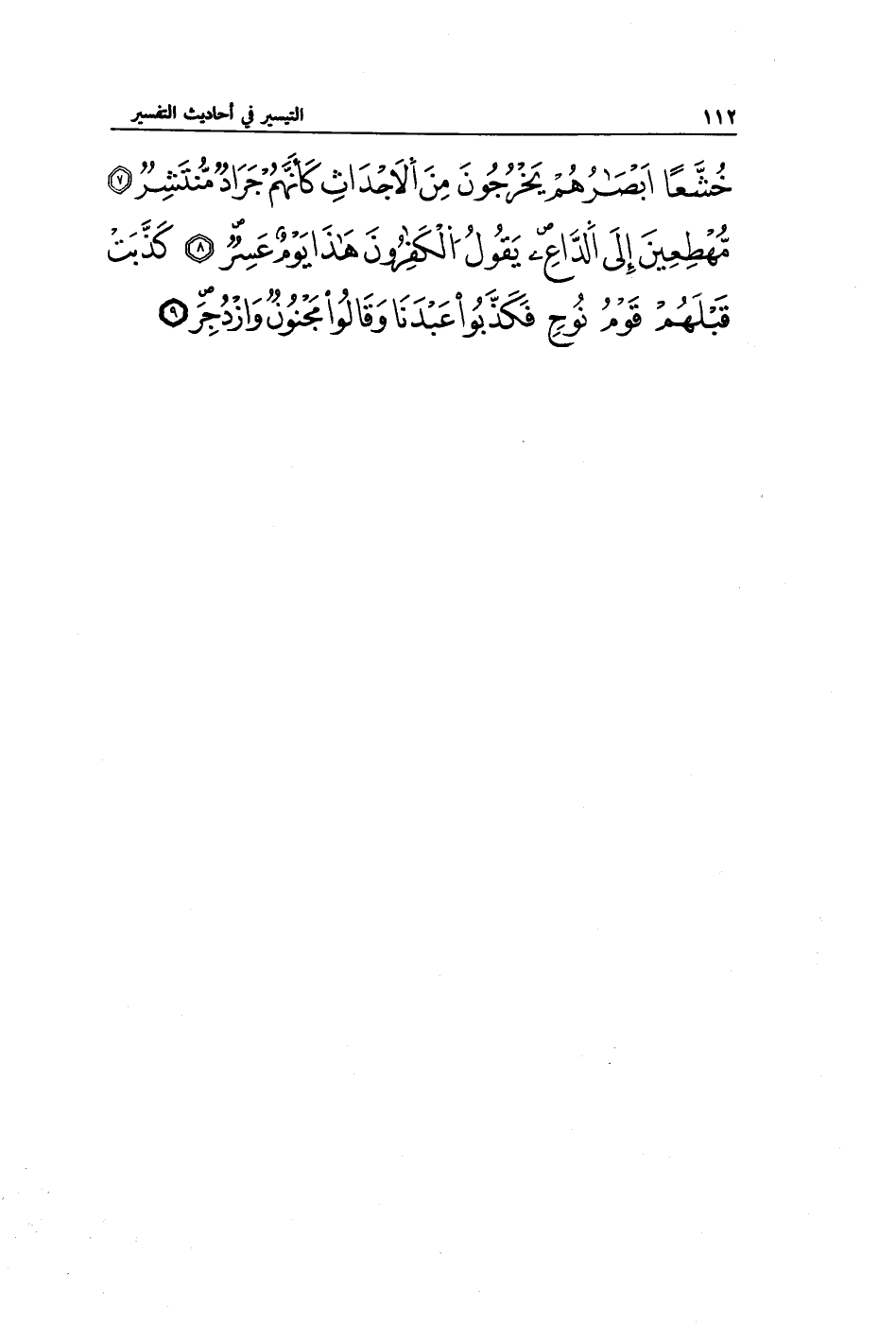 خُشَّعًا أَبْصَارُهُمْ يَخْرُجُونَ مِنَ الْأَجْدَاثِ كَأَنَّهُمْ جَرَادٌ مُنْتَشِرٌ (7) مُهْطِعِينَ إِلَى الدَّاعِ يَقُولُ الْكَافِرُونَ هَذَا يَوْمٌ عَسِرٌ (8) كَذَّبَتْ قَبْلَهُمْ قَوْمُ نُوحٍ فَكَذَّبُوا عَبْدَنَا وَقَالُوا مَجْنُونٌ وَازْدُجِرَ (9)