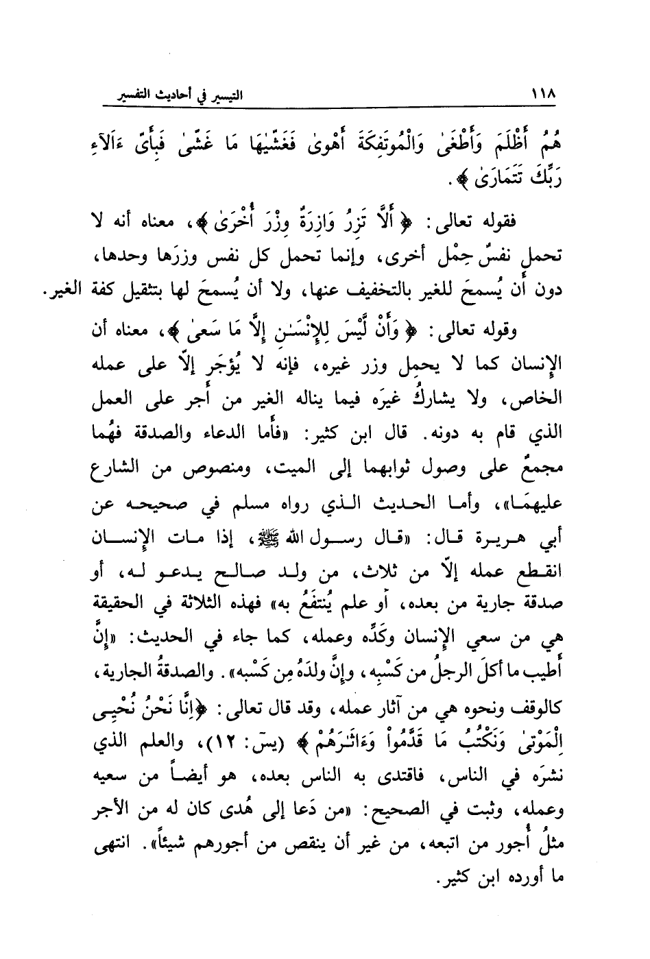 وقوله تعالى: {وَأَنْ لَيْسَ لِلْإِنْسَانِ إِلَّا مَا سَعَى}، معناه أن الإنسان كما لا يحمل وزر غيره، فإنه لا يؤجر إلا على عمله الخاص، ولا يشارك غيره فيما يناله الغير من أجر على العمل الذي قام به دونه. قال ابن كثير: " فأما الدعاء والصدقة فهما مجمع على وصول ثوابهما إلى الميت، ومنصوص من الشارع عليهما "، وأما الحديث الذي رواه مسلم في صحيحه عن أبي هريرة قال: " قال رسول الله صلى الله عليه وسلم، إذا مات الإنسان انقطع عمله إلا من ثلاث، من ولد صالح يدعو له، أو صدقة جارية من بعده، أو علم ينتفع به " فهذه الثلاثة في الحقيقة هي من سعي الإنسان وكده وعمله، كما جاء في الحديث: " إن أطيب ما أكل الرجل من كسبه، وإن ولده من كسبه ". والصدقة الجارية، كالوقف ونحوه هي من آثار عمله، وقد قال تعالى: {إِنَّا نَحْنُ نُحْيِ الْمَوْتَى وَنَكْتُبُ مَا قَدَّمُوا وَآثَارَهُمْ} (يس: 12)، والعلم الذي نشره في الناس، فاقتدى به الناس بعده، هو أيضا من سعيه وعمله، وثبت في الصحيح: " من دعا إلى هدى كان له من الأجر مثل أجور من اتبعه، من غير أن ينقص من أجورهم شيئا ". انتهى ما أورده ابن كثير.