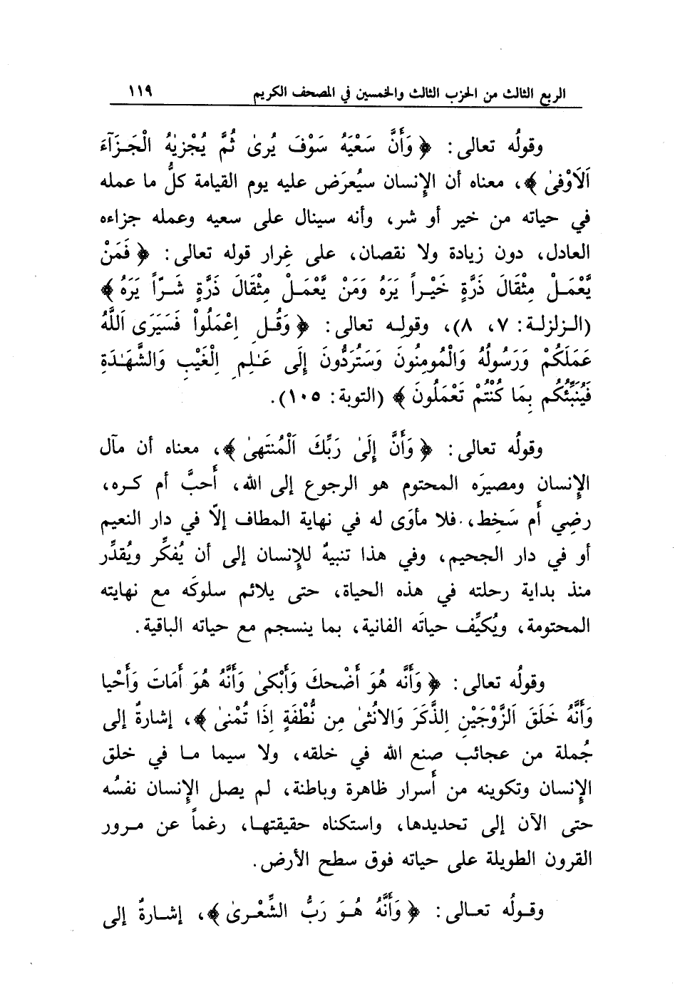 وقوله تعالى: {وَأَنَّ سَعْيَهُ سَوْفَ يُرَى (40) ثُمَّ يُجْزَاهُ الْجَزَاءَ الْأَوْفَى}، معناه أن الإنسان سيعرض عليه يوم القيامة كل ما عمله في حياته من خير أو شر، وأنه سينال على سعيه وعمله جزاءه العادل، دون زيادة ولا نقصان، على غرار قوله تعالى: {فَمَنْ يَعْمَلْ مِثْقَالَ ذَرَّةٍ خَيْرًا يَرَهُ * وَمَنْ يَعْمَلْ مِثْقَالَ ذَرَّةٍ شَرًّا يَرَهُ}، (الزلزلة: 7، 8)، وقوله تعالى: {وَقُلِ اعْمَلُوا فَسَيَرَى اللَّهُ عَمَلَكُمْ وَرَسُولُهُ وَالْمُؤْمِنُونَ وَسَتُرَدُّونَ إِلَى عَالِمِ الْغَيْبِ وَالشَّهَادَةِ فَيُنَبِّئُكُمْ بِمَا كُنْتُمْ تَعْمَلُونَ} (التوبة: 105).