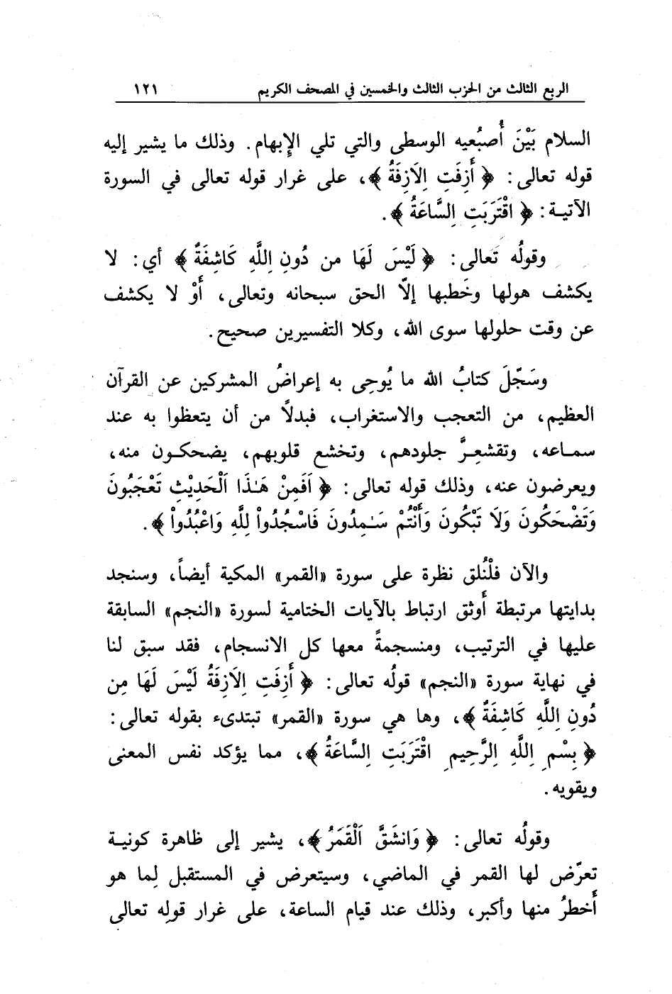 والآن فلنلق نظرة على سورة " القمر " المكية أيضا، وسنجد بدايتها مرتبطة أوثق ارتباط بالآيات الختامية لسورة " النجم " السابقة عليها في الترتيب، ومنسجمة معها كل الانسجام، فقد سبق لنا في نهاية سورة " النجم " قوله تعالى: {أَزِفَتِ الْآزِفَةُ * لَيْسَ لَهَا مِنْ دُونِ اللَّهِ كَاشِفَةٌ}، وها هي سورة " القمر " تبتدئ بقوله تعالى: {بسم الله الرحمن الرحيم اقْتَرَبَتِ السَّاعَةُ}، مما يؤكد نفس المعنى ويقويه.