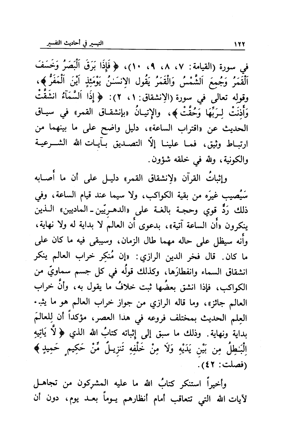 وإثبات القرآن " لانشقاق القمر " دليل على أن ما أصابه سيصيب غيره من بقية الكواكب، ولا سيما عند قيام الساعة، وفي ذلك رد قوي وحجة بالغة على " الدهريين-الماديين " الذين ينكرون " أن الساعة آتية "، بدعوى أن العالم لا بداية له ولا نهاية، وأنه سيظل على حاله مهما طال الزمان، وسيبقى فيه ما كان على ما كان، قال فخر الدين الرازي: " إن منكر خراب العالم ينكر انشقاق السماء وانفطارها، وكذلك قوله في كل جسم سماوي من الكواكب، فإذا انشق بعضها ثبت خلاف ما يقول به، وأن خراب العالم جائز "، وما قاله الرازي من جواز خراب العالم هو ما يثبته العلم الحديث بمختلف فروعه في هذا العصر، مؤكدا أن للعالم بداية ونهاية. وذلك ما سبق إلى إثباته كتاب الله الذي {لَا يَأْتِيهِ الْبَاطِلُ مِنْ بَيْنِ يَدَيْهِ وَلَا مِنْ خَلْفِهِ تَنْزِيلٌ مِنْ حَكِيمٍ حَمِيدٍ} (فصلت: 42).