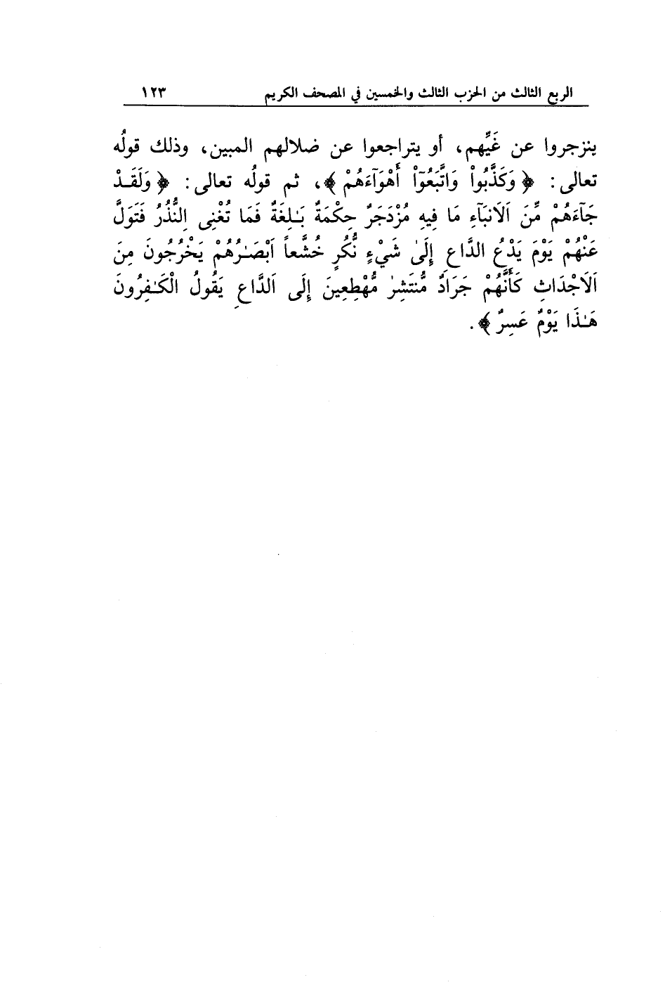 ينزجروا عن غيهم، أو يتراجعوا عن ضلالهم المبين، وذلك قوله تعالى: {وَكَذَّبُوا وَاتَّبَعُوا أَهْوَاءَهُمْ}، ثم قوله تعالى: {وَلَقَدْ جَاءَهُمْ مِنَ الْأَنْبَاءِ مَا فِيهِ مُزْدَجَرٌ * حِكْمَةٌ بَالِغَةٌ فَمَا تُغْنِ النُّذُرُ * فَتَوَلَّ عَنْهُمْ يَوْمَ يَدْعُ الدَّاعِ إِلَى شَيْءٍ نُكُرٍ * خُشَّعًا أَبْصَارُهُمْ يَخْرُجُونَ مِنَ الْأَجْدَاثِ كَأَنَّهُمْ جَرَادٌ مُنْتَشِرٌ * مُهْطِعِينَ إِلَى الدَّاعِ يَقُولُ الْكَافِرُونَ هَذَا يَوْمٌ عَسِرٌ}.