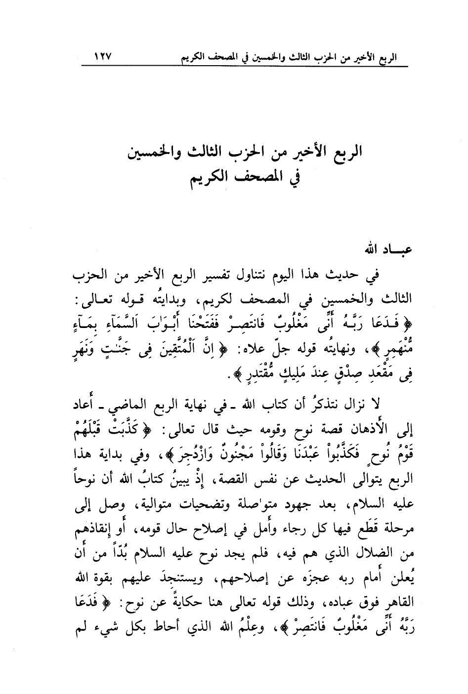 في حديث هذا اليوم نتناول تفسير الربع الأخير من الحزب الثالث والخمسين في المصحف لكريم، وبدايته قوله تعالى: {فَدَعَا رَبَّهُ أَنِّي مَغْلُوبٌ فَانْتَصِرْ * فَفَتَحْنَا أَبْوَابَ السَّمَاءِ بِمَاءٍ مُنْهَمِرٍ}، ونهايته قوله جل علاه: {إِنَّ الْمُتَّقِينَ فِي جَنَّاتٍ وَنَهَرٍ * فِي مَقْعَدِ صِدْقٍ عِنْدَ مَلِيكٍ مُقْتَدِرٍ}.