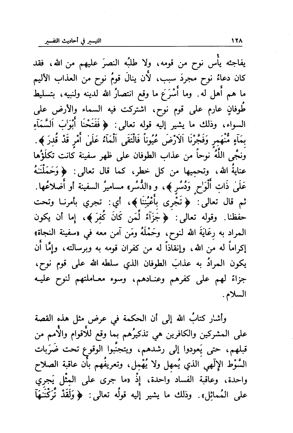 يفاجئه يأس نوح من قومه، ولا طلبه النصر عليهم من الله، فقد كان دعاء نوح مجرد سبب، لأن ينال قوم نوح من العذاب الأليم ما هم أهل له، وما أسرع ما وقع انتصار الله لدينه ولنبيه، بتسليط طوفان عارم على قوم نوح، اشتركت فيه السماء والأرض على السواء، وذلك ما يشير إليه قوله تعالى: {فَفَتَحْنَا أَبْوَابَ السَّمَاءِ بِمَاءٍ مُنْهَمِرٍ * وَفَجَّرْنَا الْأَرْضَ عُيُونًا فَالْتَقَى الْمَاءُ عَلَى أَمْرٍ قَدْ قُدِرَ}. ونجى الله نوحا من عذاب الطوفان على ظهر سفينة كانت تكلؤها عناية الله، وتحميها من كل خطر، كما قال تعالى: {وَحَمَلْنَاهُ عَلَى ذَاتِ أَلْوَاحٍ وَدُسُرٍ}، و " الدسر " مسامير السفينة أو أضلاعها. ثم قال تعالى: {تَجْرِي بِأَعْيُنِنَا}، أي تجري بأمرنا وتحت حفظنا. وقوله تعالى: {جَزَاءً لِمَنْ كَانَ كُفِرَ}، إما أن يكون المراد به رعاية الله لنوح، وحمله ومن آمن معه في " سفينة النجاة " إكراما له من الله، وإنقاذا له من كفران قومه به وبرسالته، وإما أن يكون المراد به عذاب الطوفان الذي سلطه الله على قوم نوح، جزاء لهم على كفرهم وعنادهم، وسوء معاملتهم لنوح عليه السلام.