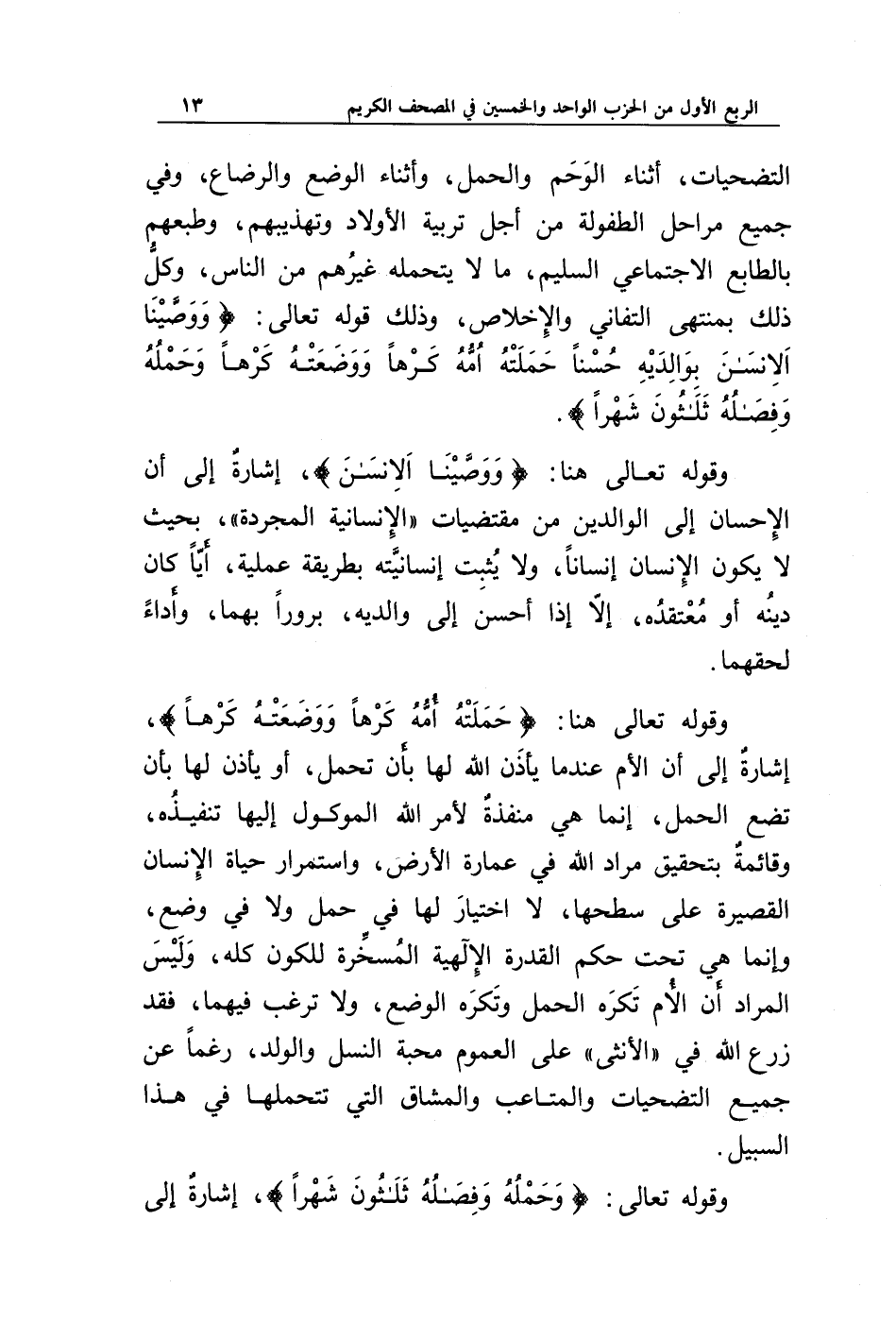 التضحيات، أثناء الوحم والحمل، وأثناء الوضع والرضاع، وفي جميع مراحل الطفولة من أجل تربية الأولاد وتهذيبهم، وطبعهم بالطابع الاجتماعي السليم، ما لا يتحمله غيرهم من الناس، وكل ذلك بمنتهى التفاني والإخلاص، وذلك قوله تعالى: {وَوَصَّيْنَا الْإِنْسَانَ بِوَالِدَيْهِ إِحْسَانًا حَمَلَتْهُ أُمُّهُ كُرْهًا وَوَضَعَتْهُ كُرْهًا وَحَمْلُهُ وَفِصَالُهُ ثَلَاثُونَ شَهْرًا}.