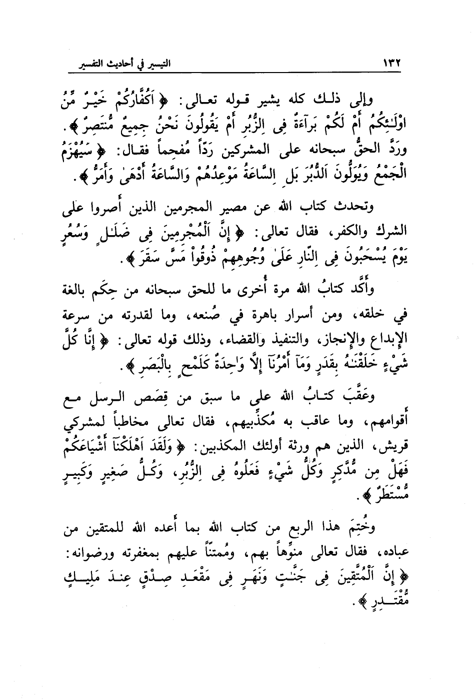 وخُتِمَ هذا الربع من كتاب الله بما أعده الله للمتقين من عباده، فقال تعالى منوها بهم، وممتنا عليهم بمغفرته ورضوانه: {إِنَّ الْمُتَّقِينَ فِي جَنَّاتٍ وَنَهَرٍ * فِي مَقْعَدِ صِدْقٍ عِنْدَ مَلِيكٍ مُقْتَدِرٍ}.