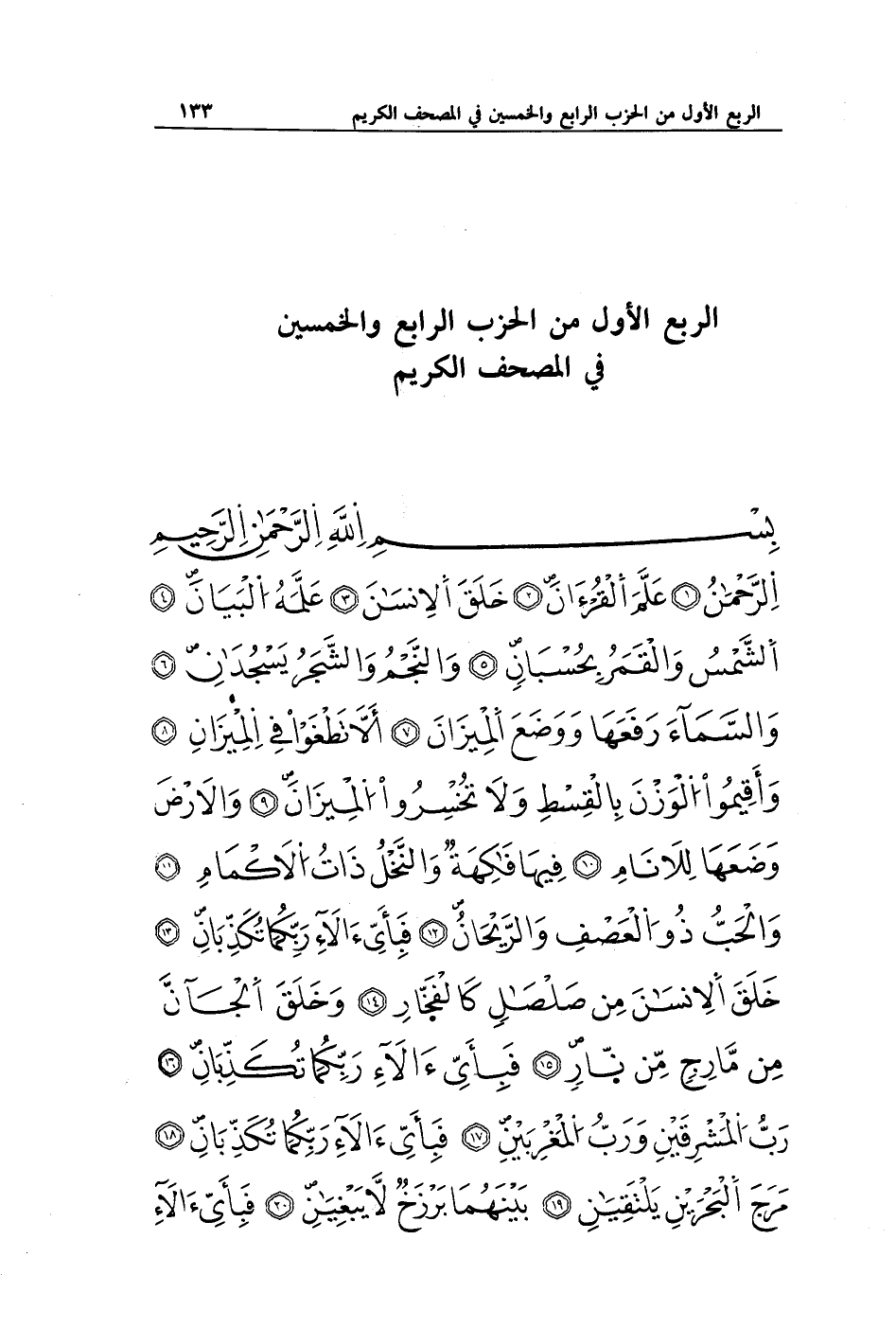 الرَّحْمَنُ (1) عَلَّمَ الْقُرْآنَ (2) خَلَقَ الْإِنْسَانَ (3) عَلَّمَهُ الْبَيَانَ (4) الشَّمْسُ وَالْقَمَرُ بِحُسْبَانٍ (5) وَالنَّجْمُ وَالشَّجَرُ يَسْجُدَانِ (6) وَالسَّمَاءَ رَفَعَهَا وَوَضَعَ الْمِيزَانَ (7) أَلَّا تَطْغَوْا فِي الْمِيزَانِ (8) وَأَقِيمُوا الْوَزْنَ بِالْقِسْطِ وَلَا تُخْسِرُوا الْمِيزَانَ (9) وَالْأَرْضَ وَضَعَهَا لِلْأَنَامِ (10) فِيهَا فَاكِهَةٌ وَالنَّخْلُ ذَاتُ الْأَكْمَامِ (11) وَالْحَبُّ ذُو الْعَصْفِ وَالرَّيْحَانُ (12) فَبِأَيِّ آلَاءِ رَبِّكُمَا تُكَذِّبَانِ (13) خَلَقَ الْإِنْسَانَ مِنْ صَلْصَالٍ كَالْفَخَّارِ (14) وَخَلَقَ الْجَانَّ مِنْ مَارِجٍ مِنْ نَارٍ (15) فَبِأَيِّ آلَاءِ رَبِّكُمَا تُكَذِّبَانِ (16) رَبُّ الْمَشْرِقَيْنِ وَرَبُّ الْمَغْرِبَيْنِ (17) فَبِأَيِّ آلَاءِ رَبِّكُمَا تُكَذِّبَانِ (18) مَرَجَ الْبَحْرَيْنِ يَلْتَقِيَانِ (19) بَيْنَهُمَا بَرْزَخٌ لَا يَبْغِيَانِ (20) فَبِأَيِّ آلَاءِ