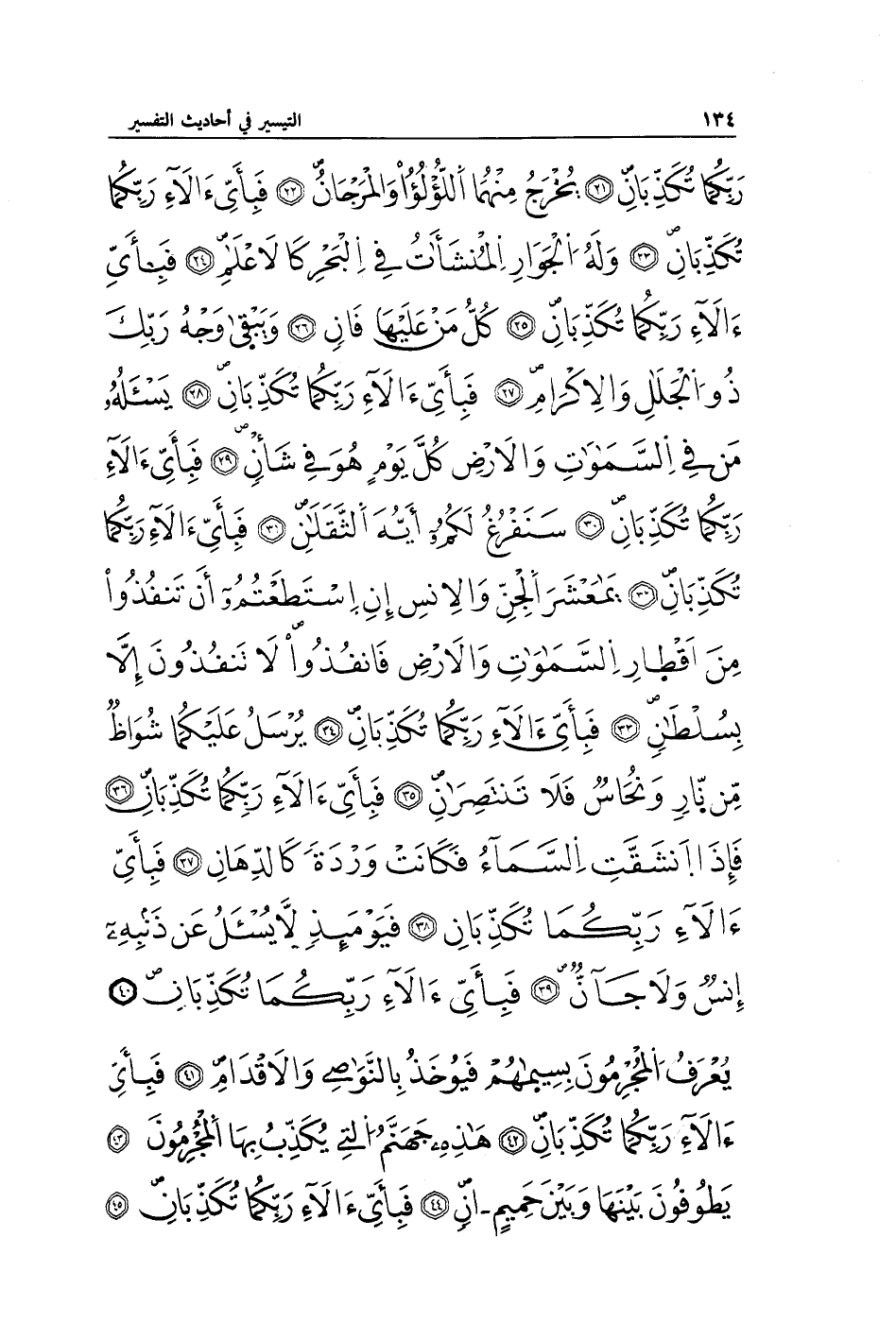 رَبِّكُمَا تُكَذِّبَانِ (21) يَخْرُجُ مِنْهُمَا اللُّؤْلُؤُ وَالْمَرْجَانُ (22) فَبِأَيِّ آلَاءِ رَبِّكُمَا تُكَذِّبَانِ (23) وَلَهُ الْجَوَارِ الْمُنْشَآتُ فِي الْبَحْرِ كَالْأَعْلَامِ (24) فَبِأَيِّ آلَاءِ رَبِّكُمَا تُكَذِّبَانِ (25) كُلُّ مَنْ عَلَيْهَا فَانٍ (26) وَيَبْقَى وَجْهُ رَبِّكَ ذُو الْجَلَالِ وَالْإِكْرَامِ (27) فَبِأَيِّ آلَاءِ رَبِّكُمَا تُكَذِّبَانِ (28) يَسْأَلُهُ مَنْ فِي السَّمَاوَاتِ وَالْأَرْضِ كُلَّ يَوْمٍ هُوَ فِي شَأْنٍ (29) فَبِأَيِّ آلَاءِ رَبِّكُمَا تُكَذِّبَانِ (30) سَنَفْرُغُ لَكُمْ أَيُّهَ الثَّقَلَانِ (31) فَبِأَيِّ آلَاءِ رَبِّكُمَا تُكَذِّبَانِ (32) يَا مَعْشَرَ الْجِنِّ وَالْإِنْسِ إِنِ اسْتَطَعْتُمْ أَنْ تَنْفُذُوا مِنْ أَقْطَارِ السَّمَاوَاتِ وَالْأَرْضِ فَانْفُذُوا لَا تَنْفُذُونَ إِلَّا بِسُلْطَانٍ (33) فَبِأَيِّ آلَاءِ رَبِّكُمَا تُكَذِّبَانِ (34) يُرْسَلُ عَلَيْكُمَا شُوَاظٌ مِنْ نَارٍ وَنُحَاسٌ فَلَا تَنْتَصِرَانِ (35) فَبِأَيِّ آلَاءِ رَبِّكُمَا تُكَذِّبَانِ (36) فَإِذَا انْشَقَّتِ السَّمَاءُ فَكَانَتْ وَرْدَةً كَالدِّهَانِ (37) فَبِأَيِّ آلَاءِ رَبِّكُمَا تُكَذِّبَانِ (38) فَيَوْمَئِذٍ لَا يُسْأَلُ عَنْ ذَنْبِهِ إِنْسٌ وَلَا جَانٌّ (39) فَبِأَيِّ آلَاءِ رَبِّكُمَا تُكَذِّبَانِ (40) يُعْرَفُ الْمُجْرِمُونَ بِسِيمَاهُمْ فَيُؤْخَذُ بِالنَّوَاصِي وَالْأَقْدَامِ (41) فَبِأَيِّ آلَاءِ رَبِّكُمَا تُكَذِّبَانِ (42) هَذِهِ جَهَنَّمُ الَّتِي يُكَذِّبُ بِهَا الْمُجْرِمُونَ (43) يَطُوفُونَ بَيْنَهَا وَبَيْنَ حَمِيمٍ آنٍ (44) فَبِأَيِّ آلَاءِ رَبِّكُمَا تُكَذِّبَانِ (45)