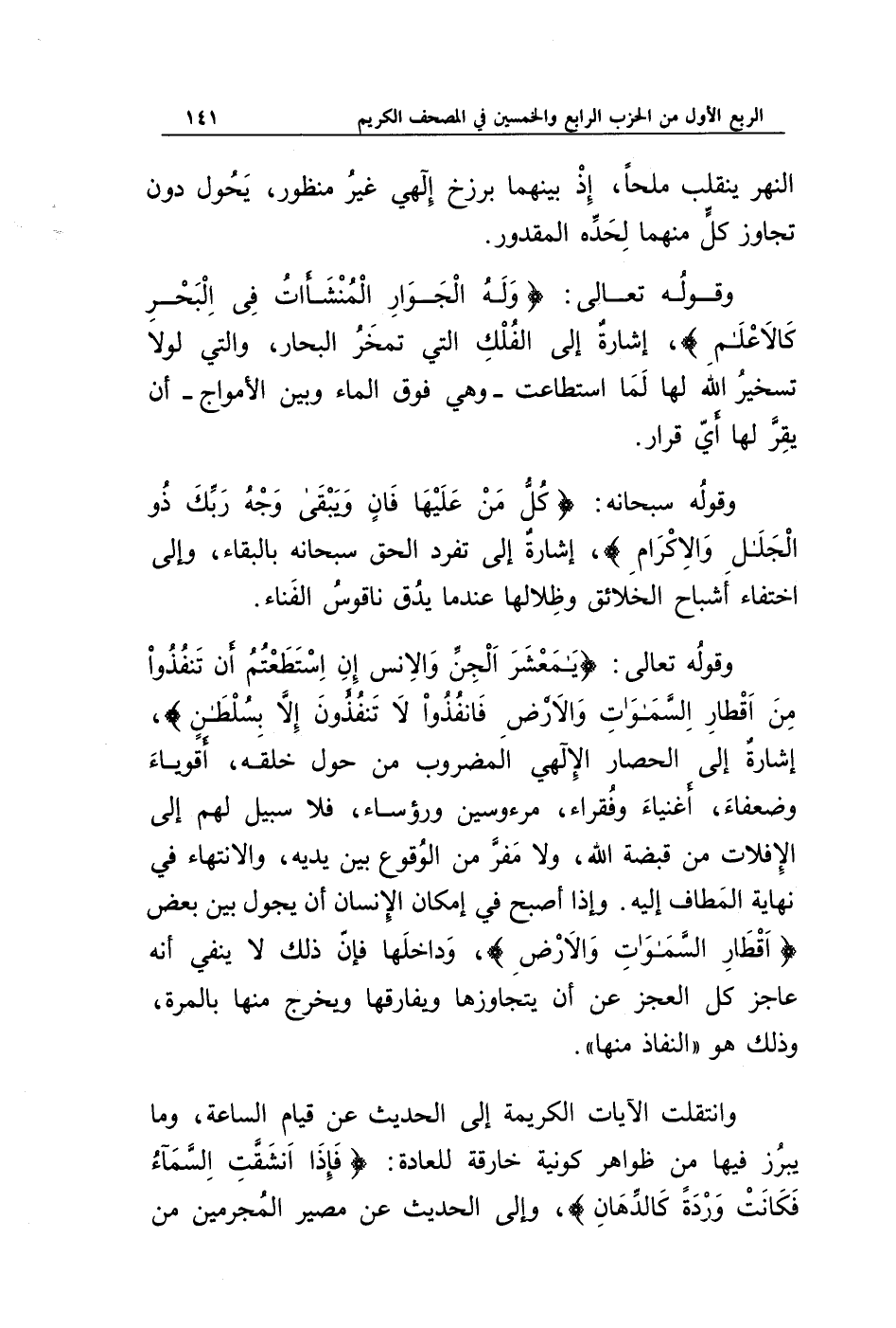 وقوله تعالى: {يَا مَعْشَرَ الْجِنِّ وَالْإِنْسِ إِنِ اسْتَطَعْتُمْ أَنْ تَنْفُذُوا مِنْ أَقْطَارِ السَّمَاوَاتِ وَالْأَرْضِ فَانْفُذُوا لَا تَنْفُذُونَ إِلَّا بِسُلْطَانٍ}، إشارة إلى الحصار الإلهي المضروب من حول خلقه، أقوياء وضعفاء، أغنياء وفقراء، مرؤوسين ورؤساء، فلا سبيل لهم إلى الإفلات من قبضة الله، ولا مفر من الوقوع بين يديه، والانتهاء في نهاية المطاف إليه. وإذا أصبح في إمكان الإنسان أن يجول بين بعض {أَقْطَارِ السَّمَاوَاتِ وَالْأَرْضِ}، وداخلها فإن ذلك لا ينفي أنه عاجز كل العجز عن أن يتجاوزها ويفارقها ويخرج منها بالمرة، وذلك هو " النفاذ منها ".
