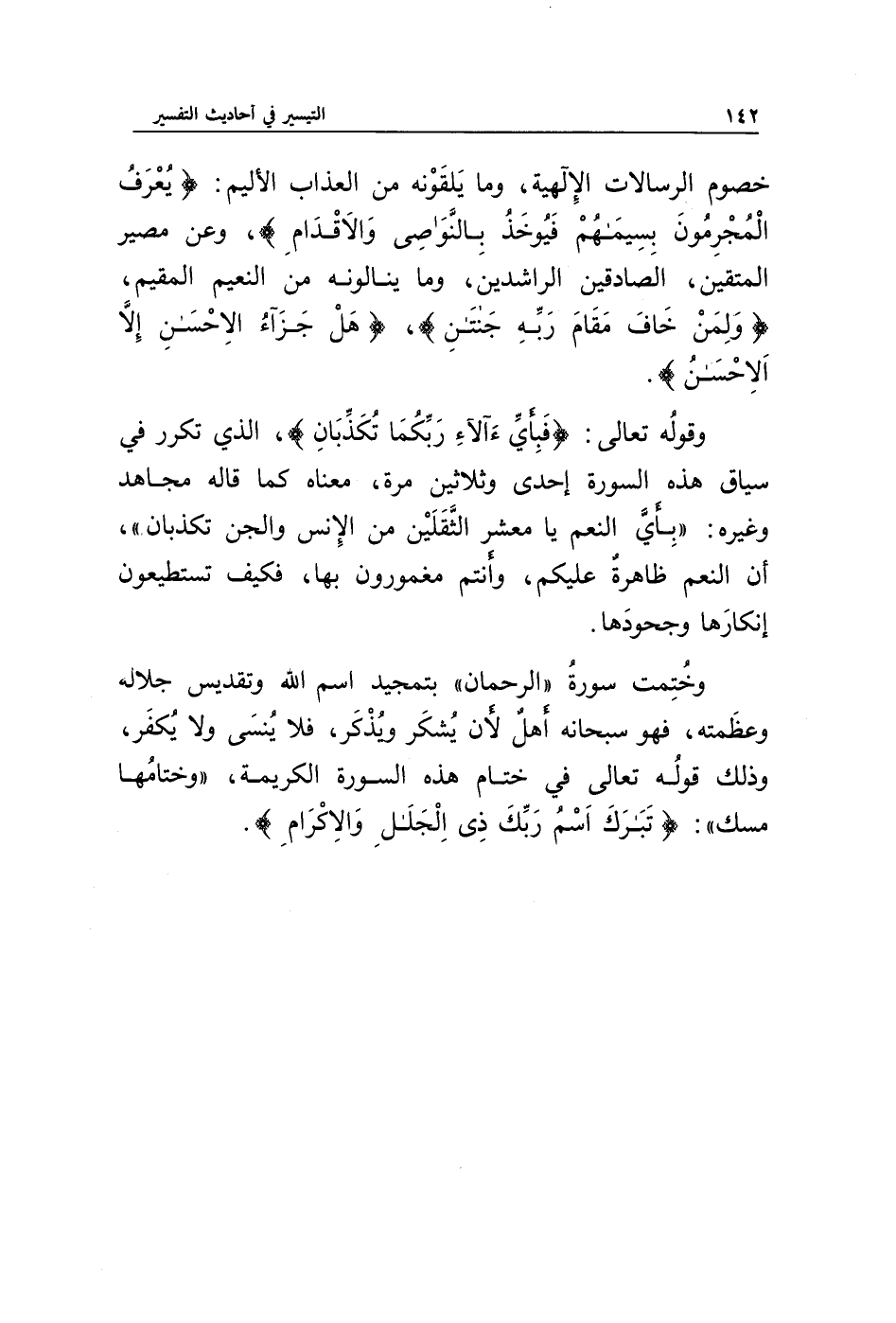 خصوم الرسالات الإلهية، وما يلقونه من العذاب الأليم: {يُعْرَفُ الْمُجْرِمُونَ بِسِيمَاهُمْ فَيُؤْخَذُ بِالنَّوَاصِي وَالْأَقْدَامِ}، وعن مصير المتقين، الصادقين الراشدين، وما ينالونه من النعيم المقيم، {وَلِمَنْ خَافَ مَقَامَ رَبِّهِ جَنَّتَانِ}، {هَلْ جَزَاءُ الْإِحْسَانِ إِلَّا الْإِحْسَانُ}.