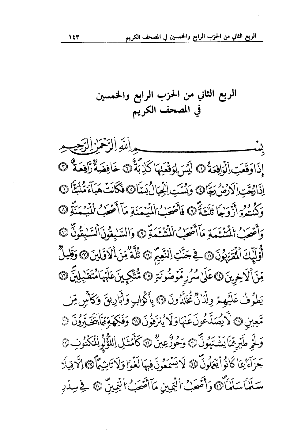 إِذَا وَقَعَتِ الْوَاقِعَةُ (1) لَيْسَ لِوَقْعَتِهَا كَاذِبَةٌ (2) خَافِضَةٌ رَافِعَةٌ (3) إِذَا رُجَّتِ الْأَرْضُ رَجًّا (4) وَبُسَّتِ الْجِبَالُ بَسًّا (5) فَكَانَتْ هَبَاءً مُنْبَثًّا (6) وَكُنْتُمْ أَزْوَاجًا ثَلَاثَةً (7) فَأَصْحَابُ الْمَيْمَنَةِ مَا أَصْحَابُ الْمَيْمَنَةِ (8) وَأَصْحَابُ الْمَشْأَمَةِ مَا أَصْحَابُ الْمَشْأَمَةِ (9) وَالسَّابِقُونَ السَّابِقُونَ (10) أُولَئِكَ الْمُقَرَّبُونَ (11) فِي جَنَّاتِ النَّعِيمِ (12) ثُلَّةٌ مِنَ الْأَوَّلِينَ (13) وَقَلِيلٌ مِنَ الْآخِرِينَ (14) عَلَى سُرُرٍ مَوْضُونَةٍ (15) مُتَّكِئِينَ عَلَيْهَا مُتَقَابِلِينَ (16) يَطُوفُ عَلَيْهِمْ وِلْدَانٌ مُخَلَّدُونَ (17) بِأَكْوَابٍ وَأَبَارِيقَ وَكَأْسٍ مِنْ مَعِينٍ (18) لَا يُصَدَّعُونَ عَنْهَا وَلَا يُنْزِفُونَ (19) وَفَاكِهَةٍ مِمَّا يَتَخَيَّرُونَ (20) وَلَحْمِ طَيْرٍ مِمَّا يَشْتَهُونَ (21) وَحُورٌ عِينٌ (22) كَأَمْثَالِ اللُّؤْلُؤِ الْمَكْنُونِ (23) جَزَاءً بِمَا كَانُوا يَعْمَلُونَ (24) لَا يَسْمَعُونَ فِيهَا لَغْوًا وَلَا تَأْثِيمًا (25) إِلَّا قِيلًا سَلَامًا سَلَامًا (26) وَأَصْحَابُ الْيَمِينِ مَا أَصْحَابُ الْيَمِينِ (27) فِي سِدْرٍ