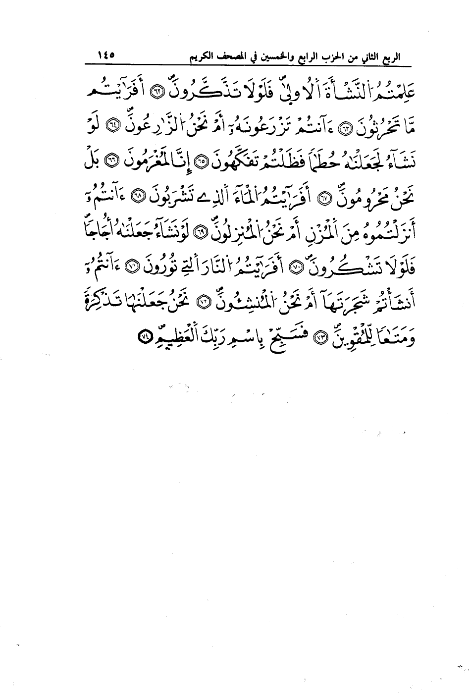 عَلِمْتُمُ النَّشْأَةَ الْأُولَى فَلَوْلَا تَذَكَّرُونَ (62) أَفَرَأَيْتُمْ مَا تَحْرُثُونَ (63) أَأَنْتُمْ تَزْرَعُونَهُ أَمْ نَحْنُ الزَّارِعُونَ (64) لَوْ نَشَاءُ لَجَعَلْنَاهُ حُطَامًا فَظَلْتُمْ تَفَكَّهُونَ (65) إِنَّا لَمُغْرَمُونَ (66) بَلْ نَحْنُ مَحْرُومُونَ (67) أَفَرَأَيْتُمُ الْمَاءَ الَّذِي تَشْرَبُونَ (68) أَأَنْتُمْ أَنْزَلْتُمُوهُ مِنَ الْمُزْنِ أَمْ نَحْنُ الْمُنْزِلُونَ (69) لَوْ نَشَاءُ جَعَلْنَاهُ أُجَاجًا فَلَوْلَا تَشْكُرُونَ (70) أَفَرَأَيْتُمُ النَّارَ الَّتِي تُورُونَ (71) أَأَنْتُمْ أَنْشَأْتُمْ شَجَرَتَهَا أَمْ نَحْنُ الْمُنْشِئُونَ (72) نَحْنُ جَعَلْنَاهَا تَذْكِرَةً وَمَتَاعًا لِلْمُقْوِينَ (73) فَسَبِّحْ بِاسْمِ رَبِّكَ الْعَظِيمِ (74)
