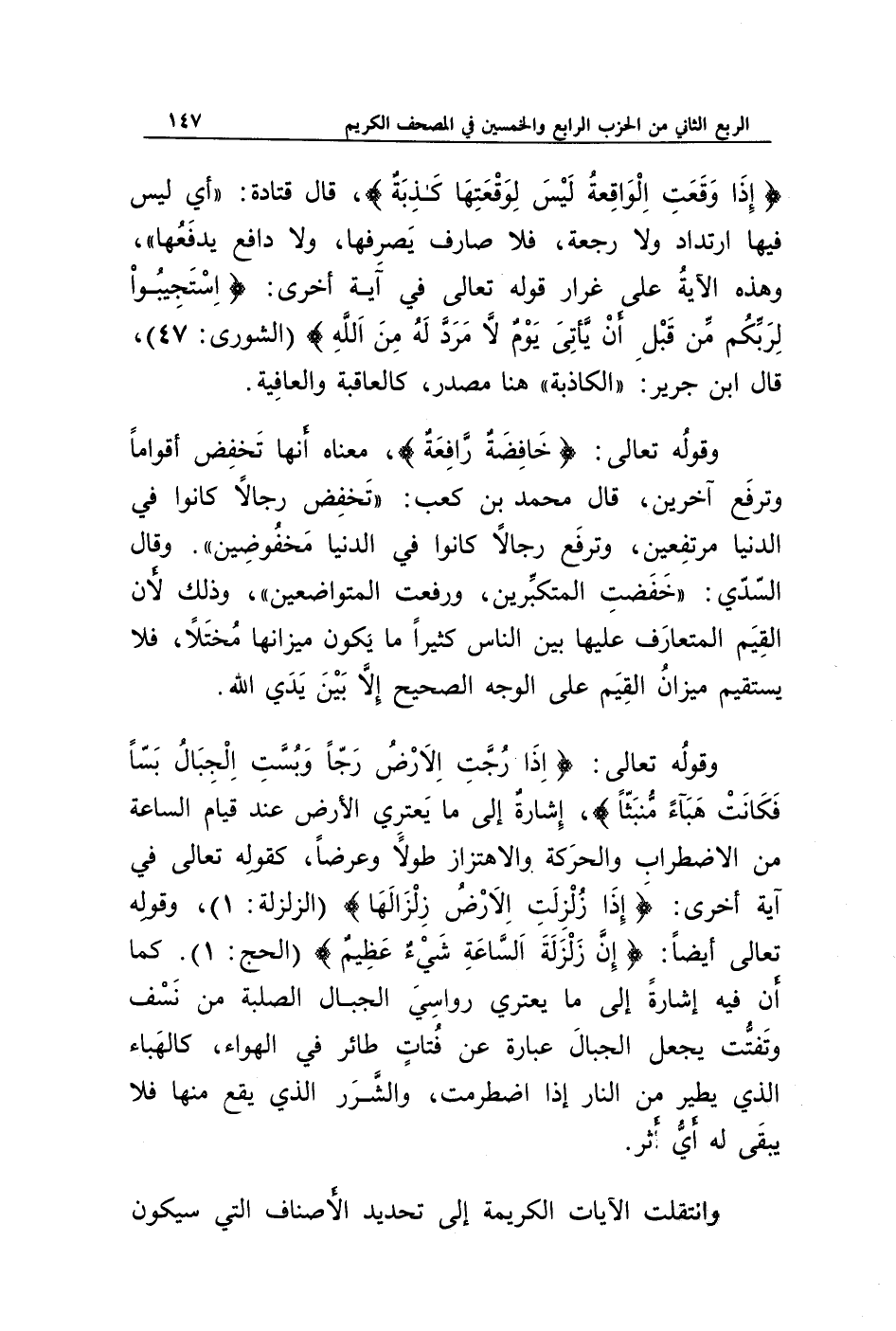 وقوله تعالى: {إِذَا رُجَّتِ الْأَرْضُ رَجًّا * وَبُسَّتِ الْجِبَالُ بَسًّا * فَكَانَتْ هَبَاءً مُنْبَثًّا}، إشارة إلى ما يعتري الأرض عند قيام الساعة من الاضطراب والحركة والاهتزاز طولا وعرضا، كقوله تعالى في آية أخرى: {إِذَا زُلْزِلَتِ الْأَرْضُ زِلْزَالَهَا} (الزلزلة: 1)، وقوله تعالى أيضا: {إِنَّ زَلْزَلَةَ السَّاعَةِ شَيْءٌ عَظِيمٌ} (الحج: 1). كما أن فيه إشارة إلى ما يعتري رواسي الجبال الصلبة من نسف وتفتت يجعل الجبال عبارة عن فتات طائر في الهواء، كالهباء الذي يطير من النار إذا اضطرمت، والشرر الذي يقع منها فلا يبقى له أي أثر.