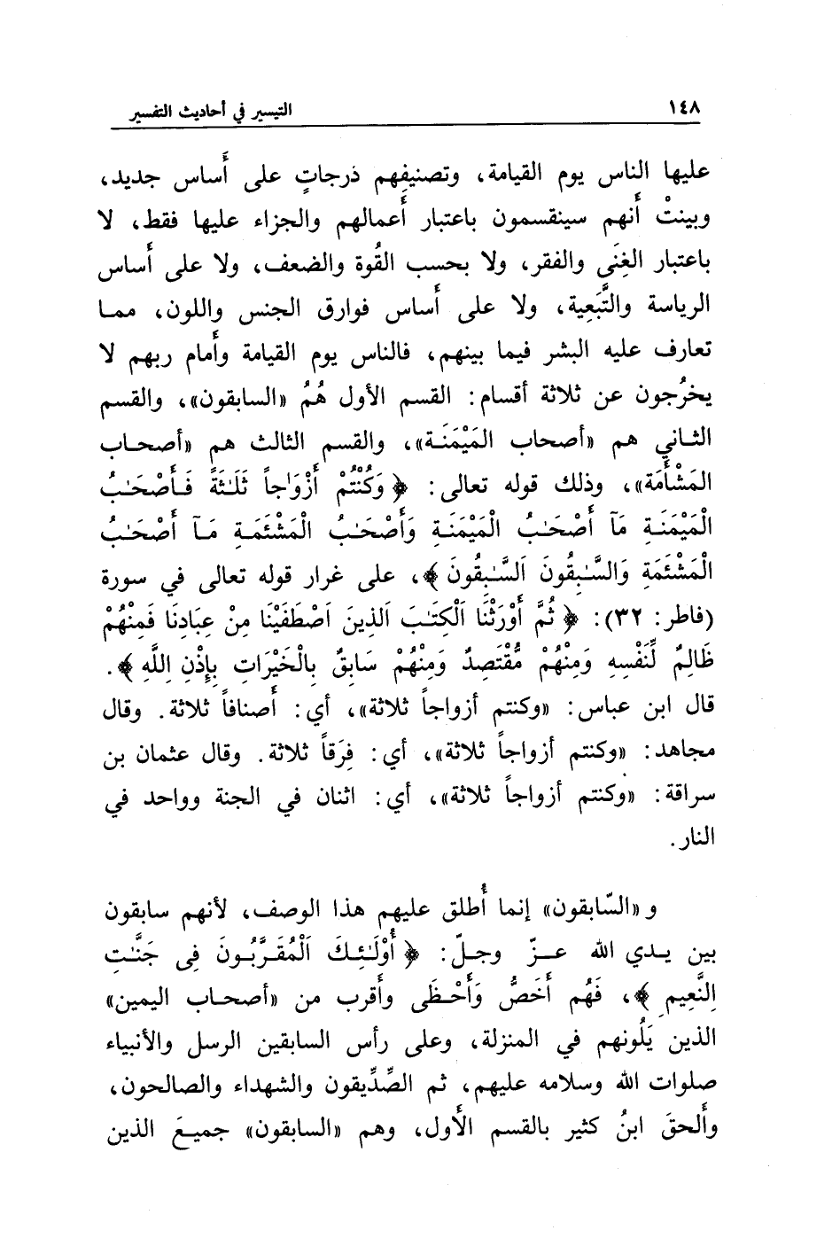 عليها الناس يوم القيامة، وتصنيفهم درجات على أساس جديد، وبينت أنهم سينقسمون باعتبار أعمالهم والجزاء عليها فقط، لا باعتبار الغنى والفقر، ولا بحسب القوة والضعف، ولا على أساس الرياسة والتبعية، ولا على أساس فوارق الجنس واللون، مما تعارف عليه البشر فيما بينهم، فالناس يوم القيامة وأمام ربهم لا يخرجون عن ثلاثة أقسام: القسم الأول هم " السابقون " والقسم الثاني هم " أصحاب الميمنة "، والقسم الثالث هم " أصحاب المشأمة "، وذلك قوله تعالى: {وَكُنْتُمْ أَزْوَاجًا ثَلَاثَةً * فَأَصْحَابُ الْمَيْمَنَةِ مَا أَصْحَابُ الْمَيْمَنَةِ * وَأَصْحَابُ الْمَشْأَمَةِ مَا أَصْحَابُ الْمَشْأَمَةِ * وَالسَّابِقُونَ السَّابِقُونَ}، على غرار قوله تعالى في سورة (فاطر: 32): {ثُمَّ أَوْرَثْنَا الْكِتَابَ الَّذِينَ اصْطَفَيْنَا مِنْ عِبَادِنَا فَمِنْهُمْ ظَالِمٌ لِنَفْسِهِ وَمِنْهُمْ مُقْتَصِدٌ وَمِنْهُمْ سَابِقٌ بِالْخَيْرَاتِ بِإِذْنِ اللَّهِ}. قال ابن عباس: " وكنتم أزواجا ثلاثة " أي: فرقا ثلاثة. وقال عثمان بن سراقة: " وكنتم أزواجا ثلاثة "، أي: اثنان في الجنة وواحد في النار.