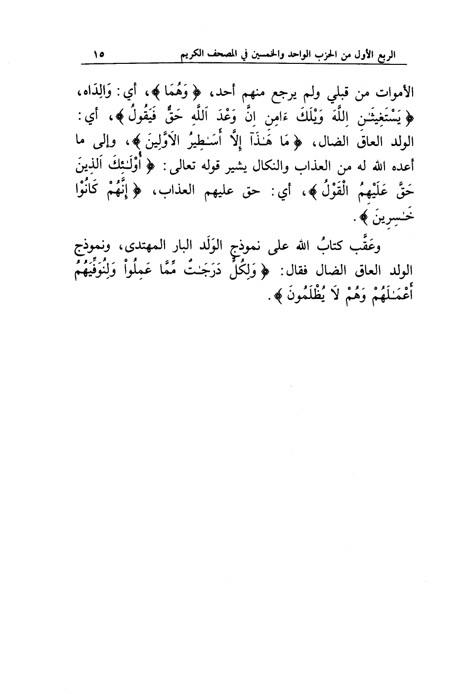 وعقب كتاب الله على نموذج الولد البار المهتدي، ونموذج الولد العاق الضال فقال: {وَلِكُلٍّ دَرَجَاتٌ مِمَّا عَمِلُوا وَلِيُوَفِّيَهُمْ أَعْمَالَهُمْ وَهُمْ لَا يُظْلَمُونَ}.