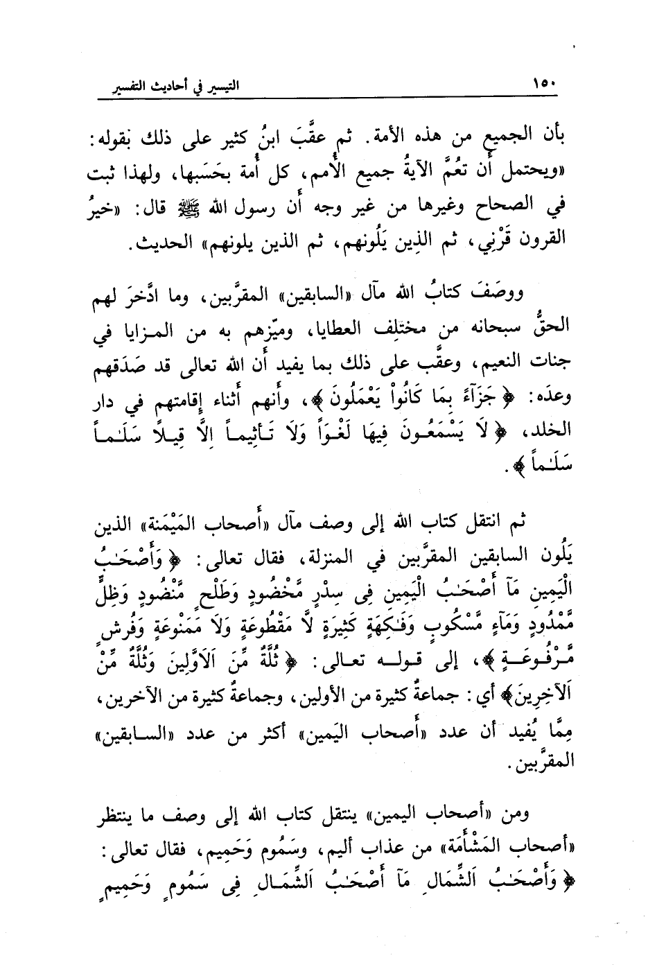 ثم انتقل كتاب الله إلى وصف مآل " أصحاب الميمنة " الذين يلون السابقين المقربين في المنزلة، فقال تعالى: {وَأَصْحَابُ الْيَمِينِ مَا أَصْحَابُ الْيَمِينِ * فِي سِدْرٍ مَخْضُودٍ * وَطَلْحٍ مَنْضُودٍ * وَظِلٍّ مَمْدُودٍ * وَمَاءٍ مَسْكُوبٍ * وَفَاكِهَةٍ كَثِيرَةٍ * لَا مَقْطُوعَةٍ وَلَا مَمْنُوعَةٍ * وَفُرُشٍ مَرْفُوعَةٍ}، إلى قوله تعالى: {ثُلَّةٌ مِنَ الْأَوَّلِينَ * وَثُلَّةٌ مِنَ الْآخِرِينَ} أي: جماعة كثيرة من الأولين، وجماعة كثيرة من الآخرين، مما يفيد أن عدد " أصحاب اليمين " أكثر من عدد " السابقين " المقربين.