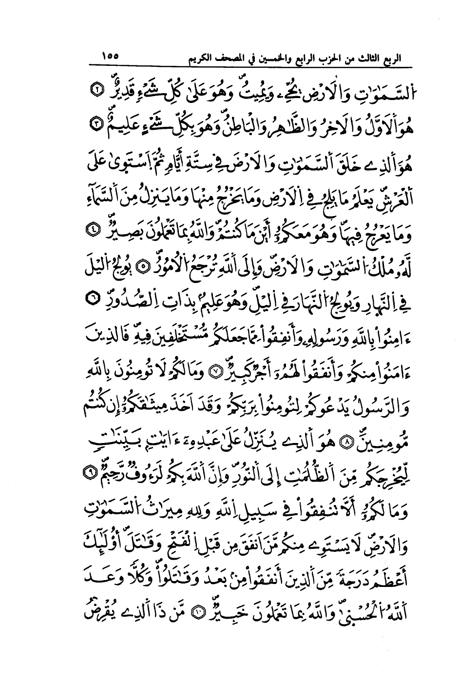 السَّمَاوَاتِ وَالْأَرْضِ يُحْيِي وَيُمِيتُ وَهُوَ عَلَى كُلِّ شَيْءٍ قَدِيرٌ (2) هُوَ الْأَوَّلُ وَالْآخِرُ وَالظَّاهِرُ وَالْبَاطِنُ وَهُوَ بِكُلِّ شَيْءٍ عَلِيمٌ (3) هُوَ الَّذِي خَلَقَ السَّمَاوَاتِ وَالْأَرْضَ فِي سِتَّةِ أَيَّامٍ ثُمَّ اسْتَوَى عَلَى الْعَرْشِ يَعْلَمُ مَا يَلِجُ فِي الْأَرْضِ وَمَا يَخْرُجُ مِنْهَا وَمَا يَنْزِلُ مِنَ السَّمَاءِ وَمَا يَعْرُجُ فِيهَا وَهُوَ مَعَكُمْ أَيْنَ مَا كُنْتُمْ وَاللَّهُ بِمَا تَعْمَلُونَ بَصِيرٌ (4) لَهُ مُلْكُ السَّمَاوَاتِ وَالْأَرْضِ وَإِلَى اللَّهِ تُرْجَعُ الْأُمُورُ (5) يُولِجُ اللَّيْلَ فِي النَّهَارِ وَيُولِجُ النَّهَارَ فِي اللَّيْلِ وَهُوَ عَلِيمٌ بِذَاتِ الصُّدُورِ (6) آمِنُوا بِاللَّهِ وَرَسُولِهِ وَأَنْفِقُوا مِمَّا جَعَلَكُمْ مُسْتَخْلَفِينَ فِيهِ فَالَّذِينَ آمَنُوا مِنْكُمْ وَأَنْفَقُوا لَهُمْ أَجْرٌ كَبِيرٌ (7) وَمَا لَكُمْ لَا تُؤْمِنُونَ بِاللَّهِ وَالرَّسُولُ يَدْعُوكُمْ لِتُؤْمِنُوا بِرَبِّكُمْ وَقَدْ أَخَذَ مِيثَاقَكُمْ إِنْ كُنْتُمْ مُؤْمِنِينَ (8) هُوَ الَّذِي يُنَزِّلُ عَلَى عَبْدِهِ آيَاتٍ بَيِّنَاتٍ لِيُخْرِجَكُمْ مِنَ الظُّلُمَاتِ إِلَى النُّورِ وَإِنَّ اللَّهَ بِكُمْ لَرَءُوفٌ رَحِيمٌ (9) وَمَا لَكُمْ أَلَّا تُنْفِقُوا فِي سَبِيلِ اللَّهِ وَلِلَّهِ مِيرَاثُ السَّمَاوَاتِ وَالْأَرْضِ لَا يَسْتَوِي مِنْكُمْ مَنْ أَنْفَقَ مِنْ قَبْلِ الْفَتْحِ وَقَاتَلَ أُولَئِكَ أَعْظَمُ دَرَجَةً مِنَ الَّذِينَ أَنْفَقُوا مِنْ بَعْدُ وَقَاتَلُوا وَكُلًّا وَعَدَ اللَّهُ الْحُسْنَى وَاللَّهُ بِمَا تَعْمَلُونَ خَبِيرٌ (10) مَنْ ذَا الَّذِي يُقْرِضُ