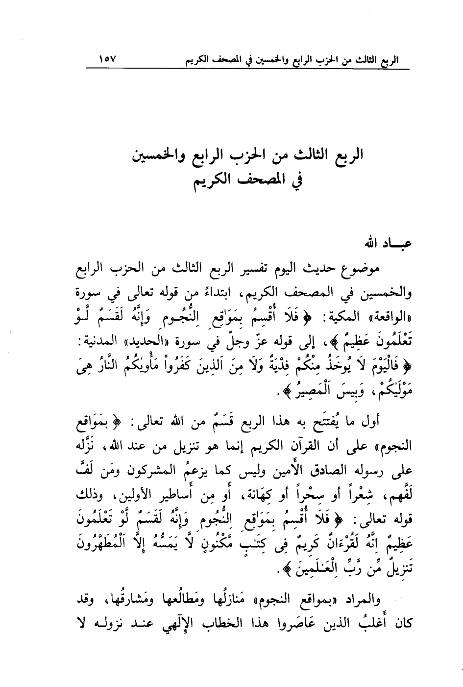 موضوع حديث اليوم تفسير الربع الثالث من الحزب الرابع والخمسين في المصحف الكريم، ابتداء من قوله تعالى في سورة "الواقعة" المكية: {فَلَا أُقْسِمُ بِمَوَاقِعِ النُّجُومِ * وَإِنَّهُ لَقَسَمٌ لَوْ تَعْلَمُونَ عَظِيمٌ}، إلى قوله عز وجل في سورة "الحديد" المدنية: {فَالْيَوْمَ لَا يُؤْخَذُ مِنْكُمْ فِدْيَةٌ وَلَا مِنَ الَّذِينَ كَفَرُوا مَأْوَاكُمُ النَّارُ هِيَ مَوْلَاكُمْ وَبِئْسَ الْمَصِيرُ}.
