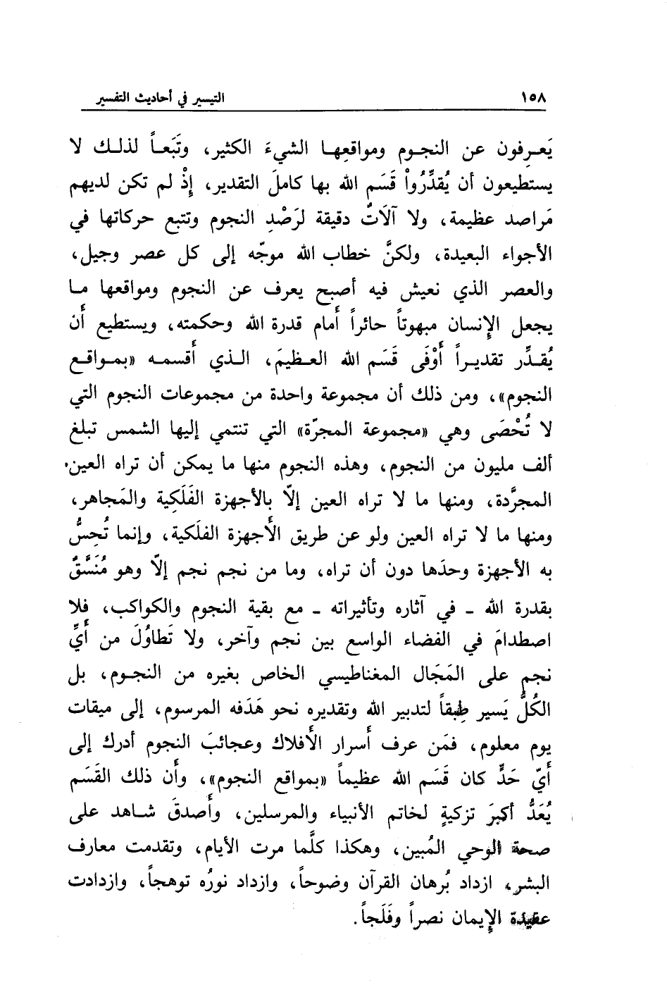 يعرفون عن النجوم ومواقعها الشيء الكثير، وتبعا لذلك لا يستطيعون أن يقدروا قسم الله بها كامل التقدير، إذ لم تكن لديهم مراصد عظيمة، ولا آلات دقيقة لرصد النجوم وتتبع حركاتها في الأجواء البعيدة، ولكن خطاب الله موجه إلى كل عصر وجيل، والعصر الذي نعيش فيه أصبح يعرف عن النجوم ومواقعها ما يجعل الإنسان مبهوتا حائرا أمام قدرة الله وحكمته، ويستطيع أن يقدر تقديرا أوفى قسم الله العظيم، الذي أقسمه " بمواقع النجوم "، ومن ذلك أن مجموعة واحدة من مجموعات النجوم التي لا تحصى وهي " مجموعة المجرة " التي تنتمي إليها الشمس تبلغ ألف مليون من النجوم، وهذه النجوم منها ما يمكن أن تراه العين المجردة، ومنها ما لا تراه العين إلا بالأجهزة الفلكية والمجاهر، ومنها ما لا تراه العين ولوعن طريق الأجهزة الفلكية، وإنما تحس به الأجهزة وحدها دون أن تراه، وما من نجم إلا وهو منسق بقدرة الله -في آثاره وتأثيراته- مع بقية النجوم والكواكب، فلا اصطدام في الفضاء الواسع بين نجم وآخر، ولا تطاول من أي نجم على المجال المغناطيسي الخاص بغيره من النجوم، بل الكل يسير طبقا لتدبير الله وتقديره نحو هدفه المرسوم، إلى ميقات يوم معلوم، فمن عرف أسرار الأفلاك وعجائب النجوم أدرك إلى أي حد كان قسم الله عظيما " بمواقع النجوم "، وأن ذلك القسم يعد أكبر تزكية لخاتم الأنبياء والمرسلين، وأصدق شاهد على صحة الوحي المبين، وهكذا كلما مرت الأيام، وتقدمت معارف البشر، ازداد برهان القرآن وضوحا، وازداد نوره توهجا، وازدادت عقيدة الإيمان نصرا وفلجا.