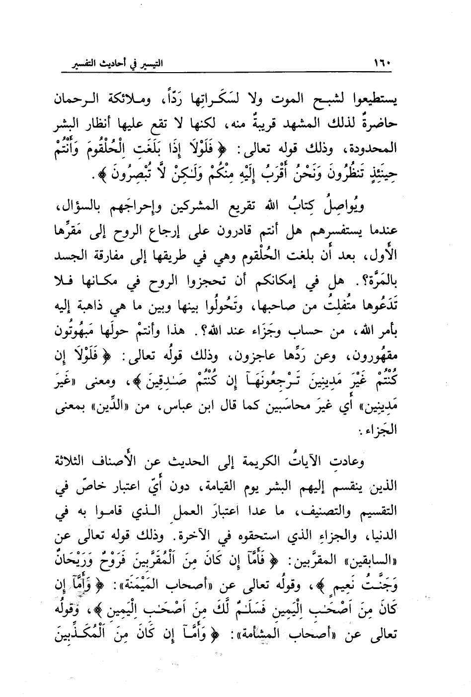 وعادت الآيات الكريمة إلى الحديث عن الأصناف الثلاثة الذين ينقسم إليهم البشر يوم القيامة، دون أي اعتبار خاص في التقسيم والتصنيف، ما عدا اعتبار العمل الذي قاموا به في الدنيا، والجزاء الذي استحقوه في الآخرة. وذلك قوله تعالى عن " السابقين " المقربين: {فَأَمَّا إِنْ كَانَ مِنَ الْمُقَرَّبِينَ * فَرَوْحٌ وَرَيْحَانٌ وَجَنَّتُ نَعِيمٍ}، وقوله تعالى عن " أصحاب الميمنة ": {وَأَمَّا إِنْ كَانَ مِنْ أَصْحَابِ الْيَمِينِ * فَسَلَامٌ لَكَ مِنْ أَصْحَابِ الْيَمِينِ}، وقوله تعالى عن " أصحاب المشأمة ": {وَأَمَّا إِنْ كَانَ مِنَ الْمُكَذِّبِينَ