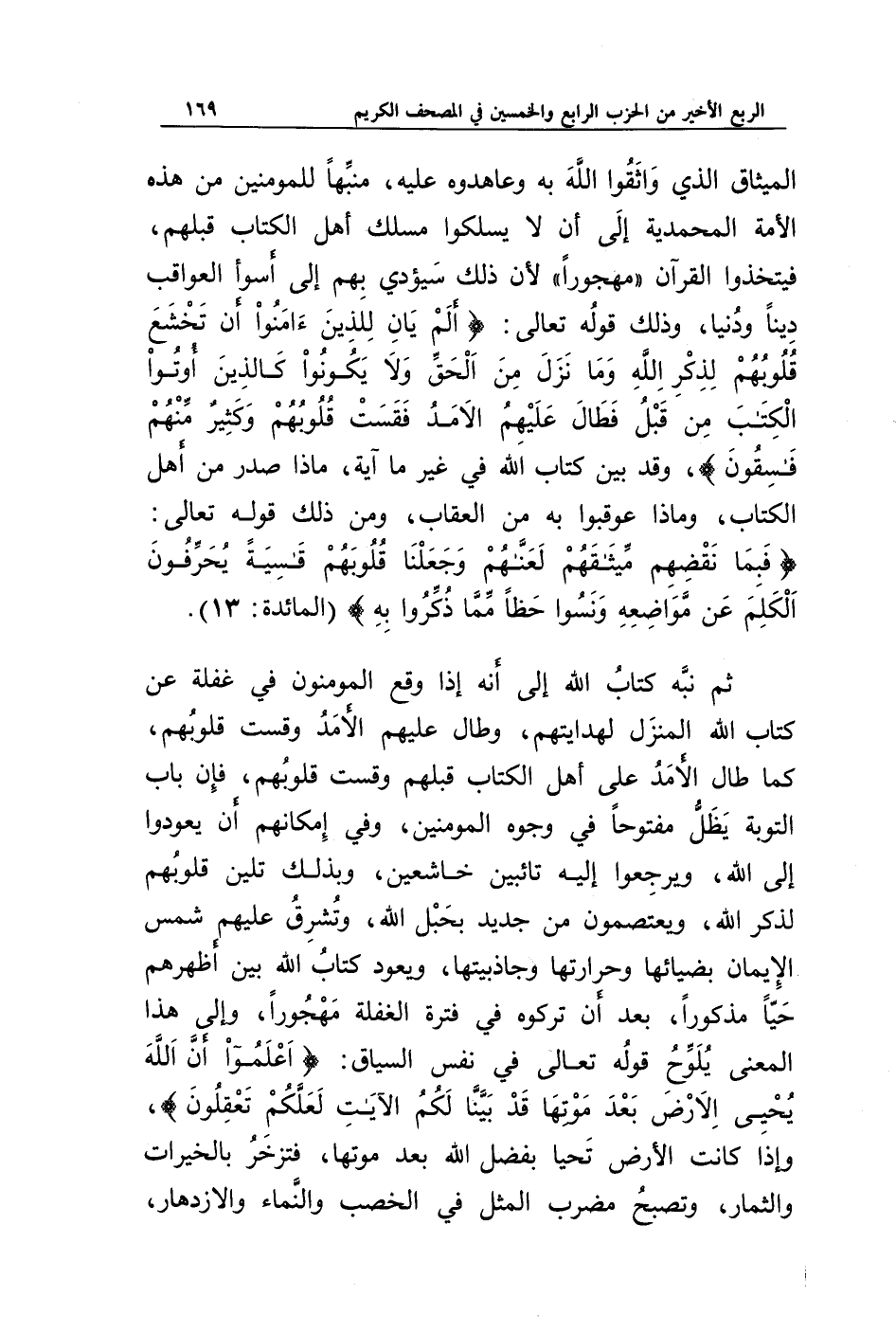 الميثاق الذي واثقوا الله به وعاهدوه عليه، منبها للمؤمنين من هذه الأمة المحمدية إلى أن لا يسلكوا مسلك أهل الكتاب قبلهم، فيتخذوا القرآن " مهجورا " لأن ذلك سيؤدي بهم إلى أسوأ العواقب دينا ودنيا، وذلك قوله تعالى: {أَلَمْ يَأْنِ لِلَّذِينَ آمَنُوا أَنْ تَخْشَعَ قُلُوبُهُمْ لِذِكْرِ اللَّهِ وَمَا نَزَلَ مِنَ الْحَقِّ وَلَا يَكُونُوا كَالَّذِينَ أُوتُوا الْكِتَابَ مِنْ قَبْلُ فَطَالَ عَلَيْهِمُ الْأَمَدُ فَقَسَتْ قُلُوبُهُمْ وَكَثِيرٌ مِنْهُمْ فَاسِقُونَ}، وقد بين كتاب الله في غير ما آية، ماذا صدر من أهل الكتاب، وما عوقبوا به من العقاب، ومن ذلك قوله تعالى: {فَبِمَا نَقْضِهِمْ مِيثَاقَهُمْ لَعَنَّاهُمْ وَجَعَلْنَا قُلُوبَهُمْ قَاسِيَةً يُحَرِّفُونَ الْكَلِمَ عَنْ مَوَاضِعِهِ وَنَسُوا حَظًّا مِمَّا ذُكِّرُوا بِهِ} (المائدة: 13).