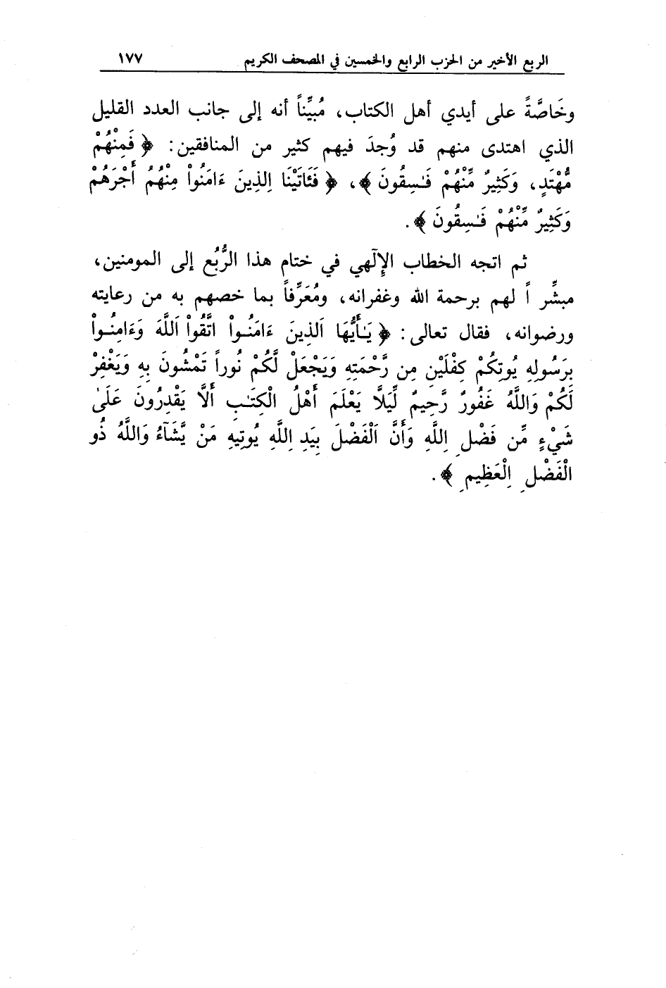 ثم اتجه الخطاب الإلهي في ختام هذا الربع إلى المؤمنين، مبشرا لهم برحمة الله وغفرانه، ومعرفا بما خصهم به من رعايته ورضوانه، فقال تعالى: {يَا أَيُّهَا الَّذِينَ آمَنُوا اتَّقُوا اللَّهَ وَآمِنُوا بِرَسُولِهِ يُؤْتِكُمْ كِفْلَيْنِ مِنْ رَحْمَتِهِ وَيَجْعَلْ لَكُمْ نُورًا تَمْشُونَ بِهِ وَيَغْفِرْ لَكُمْ وَاللَّهُ غَفُورٌ رَحِيمٌ * لِئَلَّا يَعْلَمَ أَهْلُ الْكِتَابِ أَلَّا يَقْدِرُونَ عَلَى شَيْءٍ مِنْ فَضْلِ اللَّهِ وَأَنَّ الْفَضْلَ بِيَدِ اللَّهِ يُؤْتِيهِ مَنْ يَشَاءُ وَاللَّهُ ذُو الْفَضْلِ الْعَظِيمِ}.